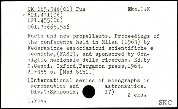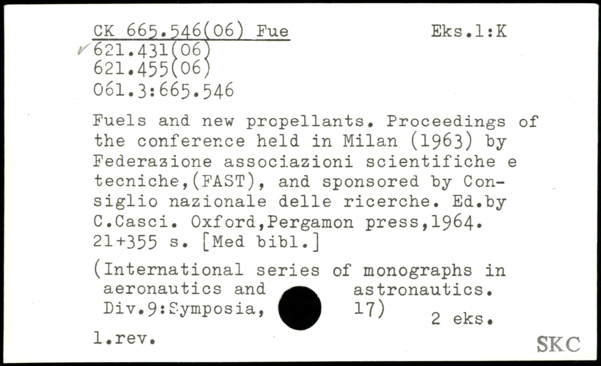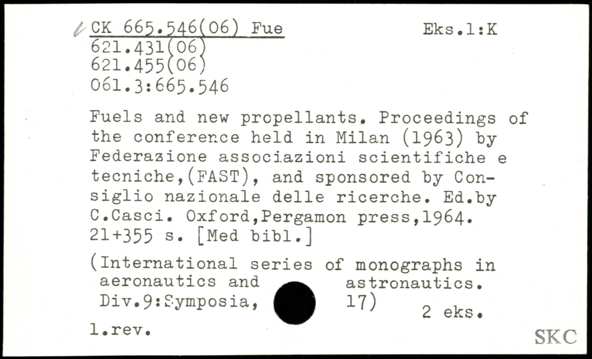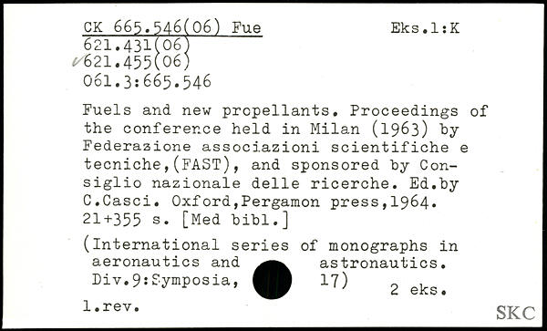 Fuels arid new propellants. Proceedings of the conference held in Milan (1963) by Federazione associazioni scientifiche e tecniche,(FAST), and sponsored hy Con-siglio nazionale delle ricerche. Ed.hy C.Casci.