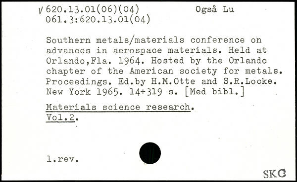 Southern metals/materials conference on advances in aerospace materials. Held at Orlando,Fla. 1964. Hosted by the Orlando chapter of the American society for metals. Proceedings. Ed.by H.M.Otte and S.R.Locke.