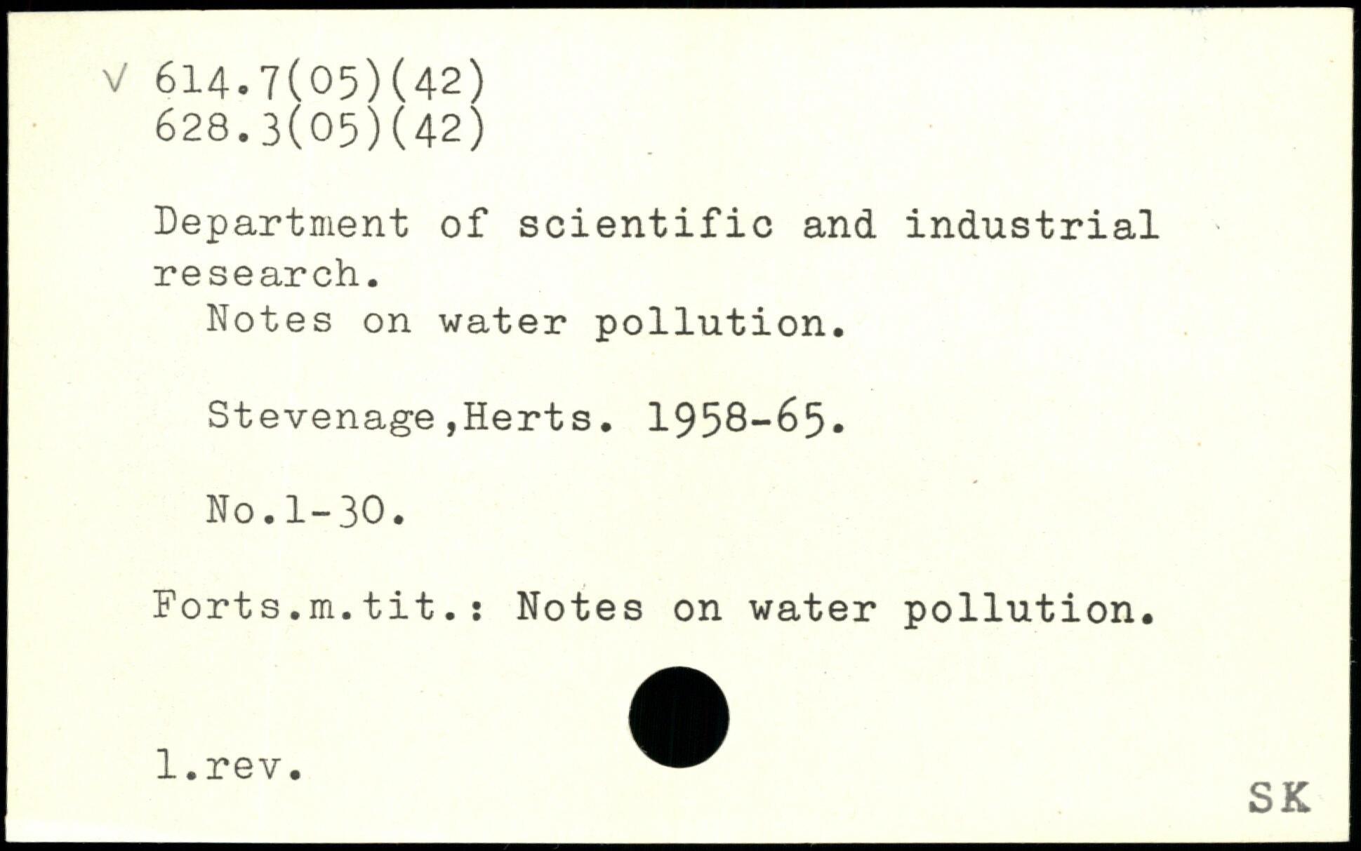 Department of scientific and industrial research. Notes on water pollution. Stevenage,Herts. 1958-65. No.1-30. Forts.m.tit.: Notes on water pollution.