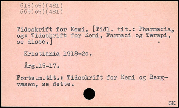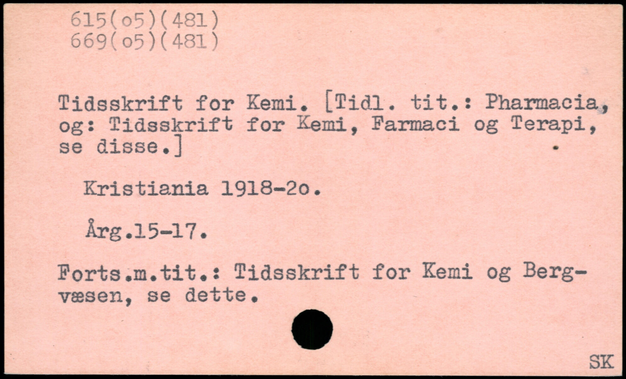 Tidsskrift for Kemi. [Tidl. tit.: Pharmacia, og: Tidsskrift for Kemi, Farmaci og Terapi, se disse.] Kristiania 1918-20. Årg.15-17. Forts.m.tit.: Tidsskrift for Kemi og Berg-væsen, se dette.