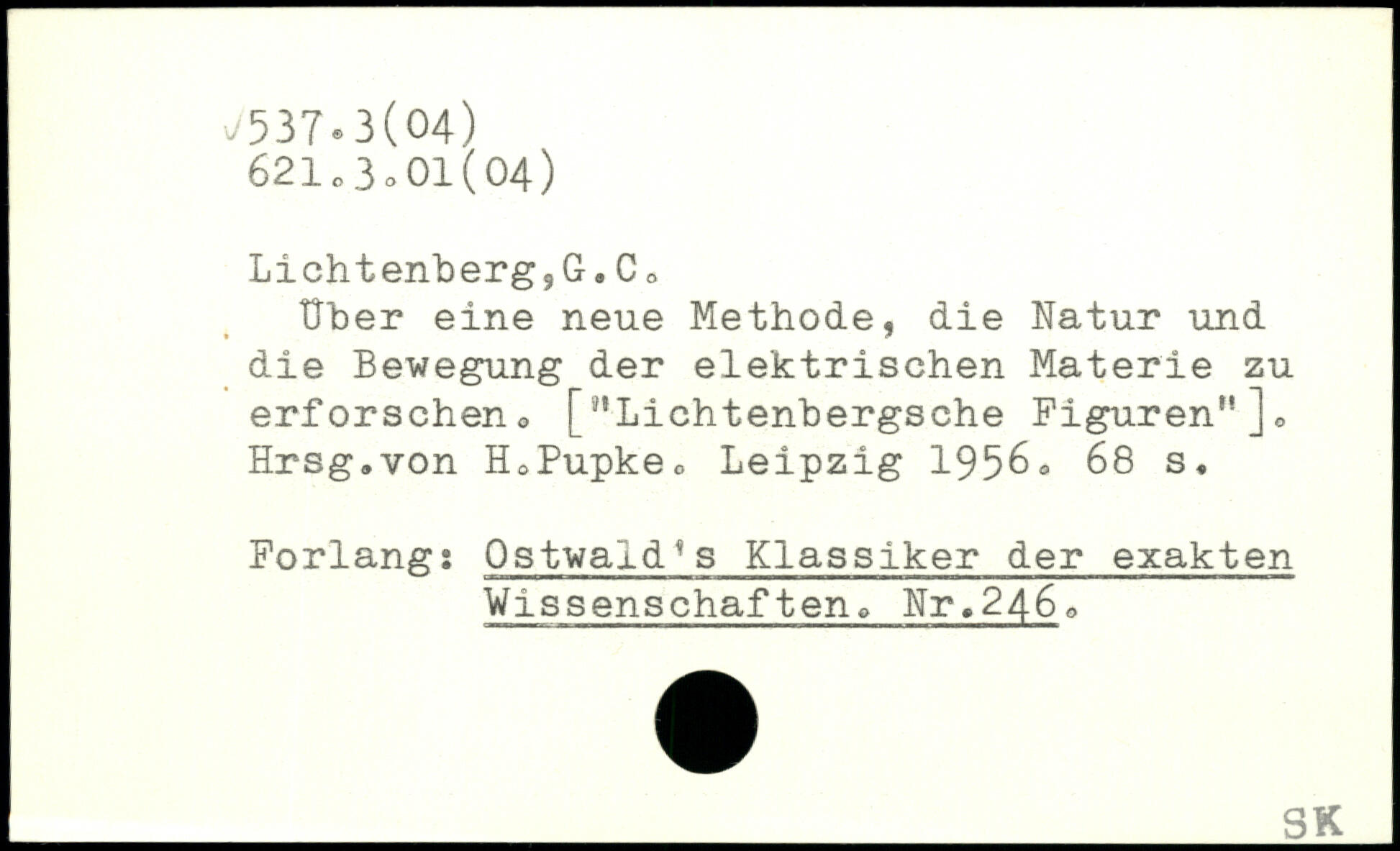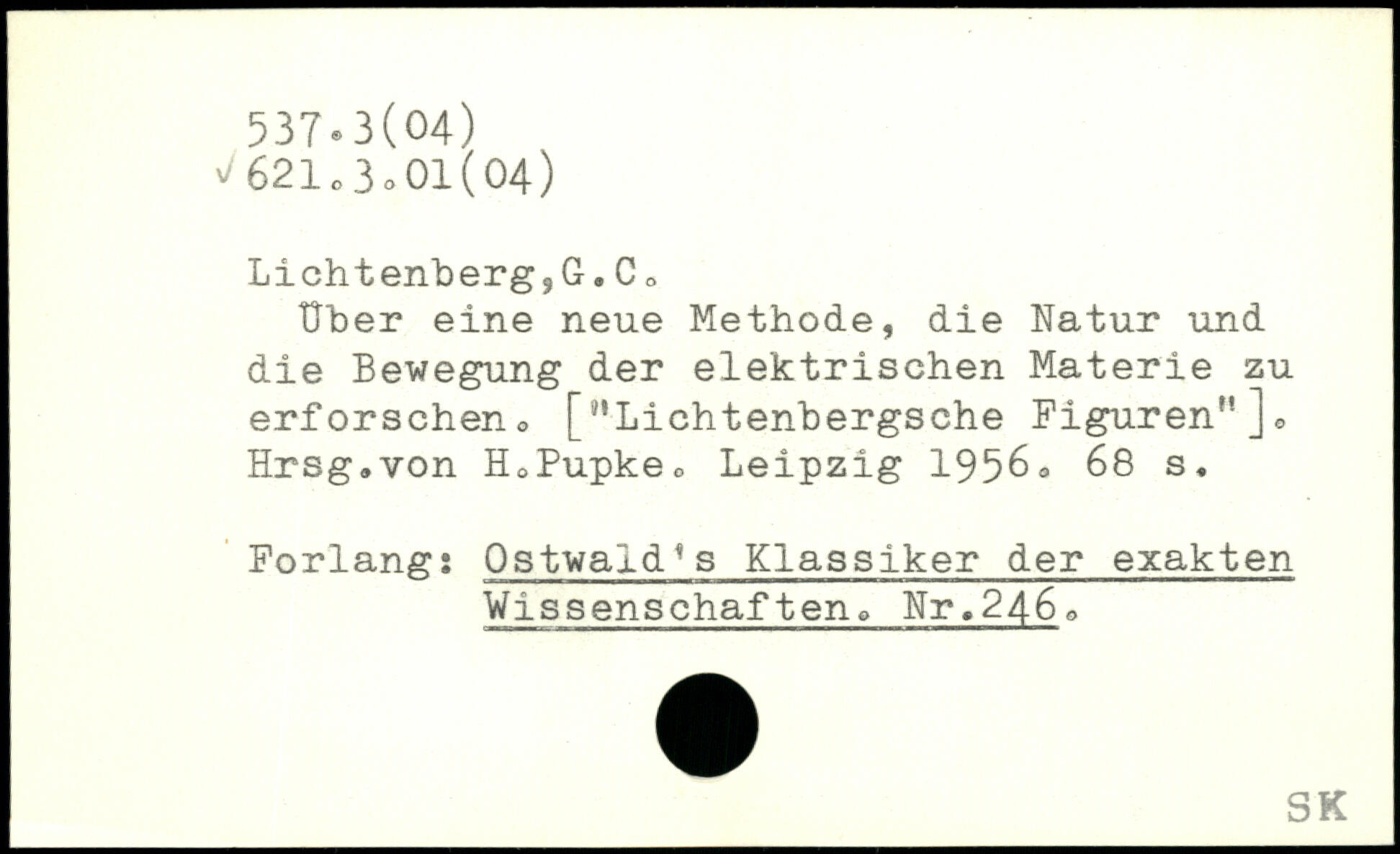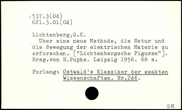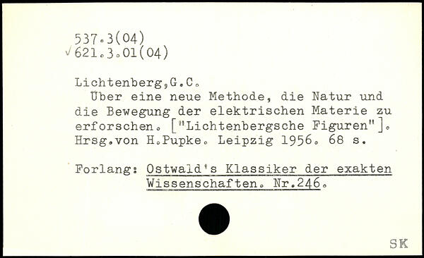 Uber eine neue Methode, die Natur und die Bewegung der elektrischen Materie zu erforscheno ["Lichtenbergsche Figuren"]. Hrsg.von H.Pupke.