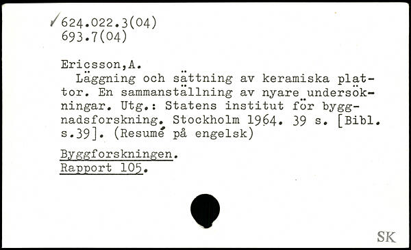 Läggning och sättning av keraraiska plattor. En sammanställning av nyare undersökningar. Utg.: Statens institut för byggnadsforskning.