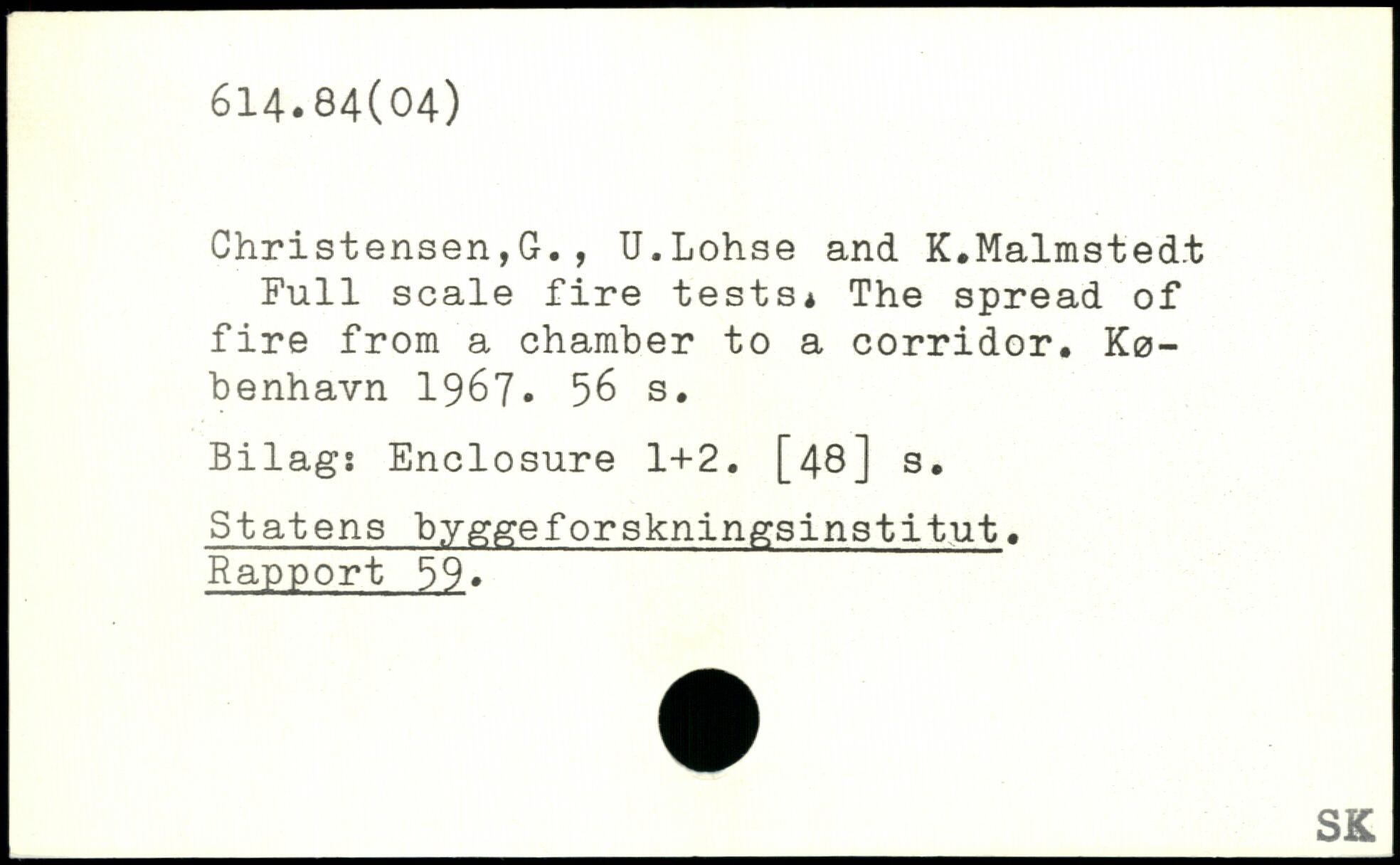 Christensen,G. , U.Lohse and K.Malmsted.t Full scale fire tests. The spread of fire from a chamber to a corridor.