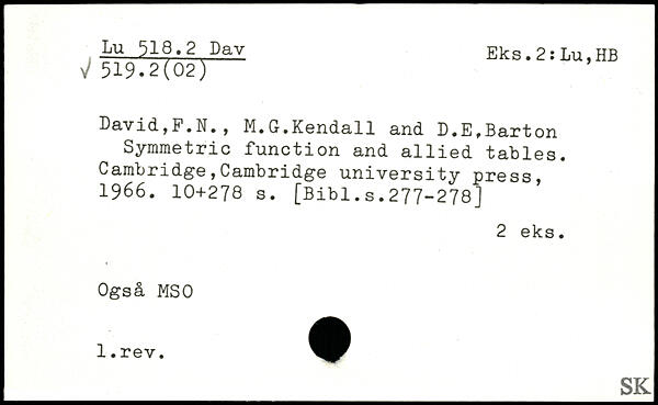 David,F.N., M.G.Kendall and D.E,Barton Symmetric function and allied tables.