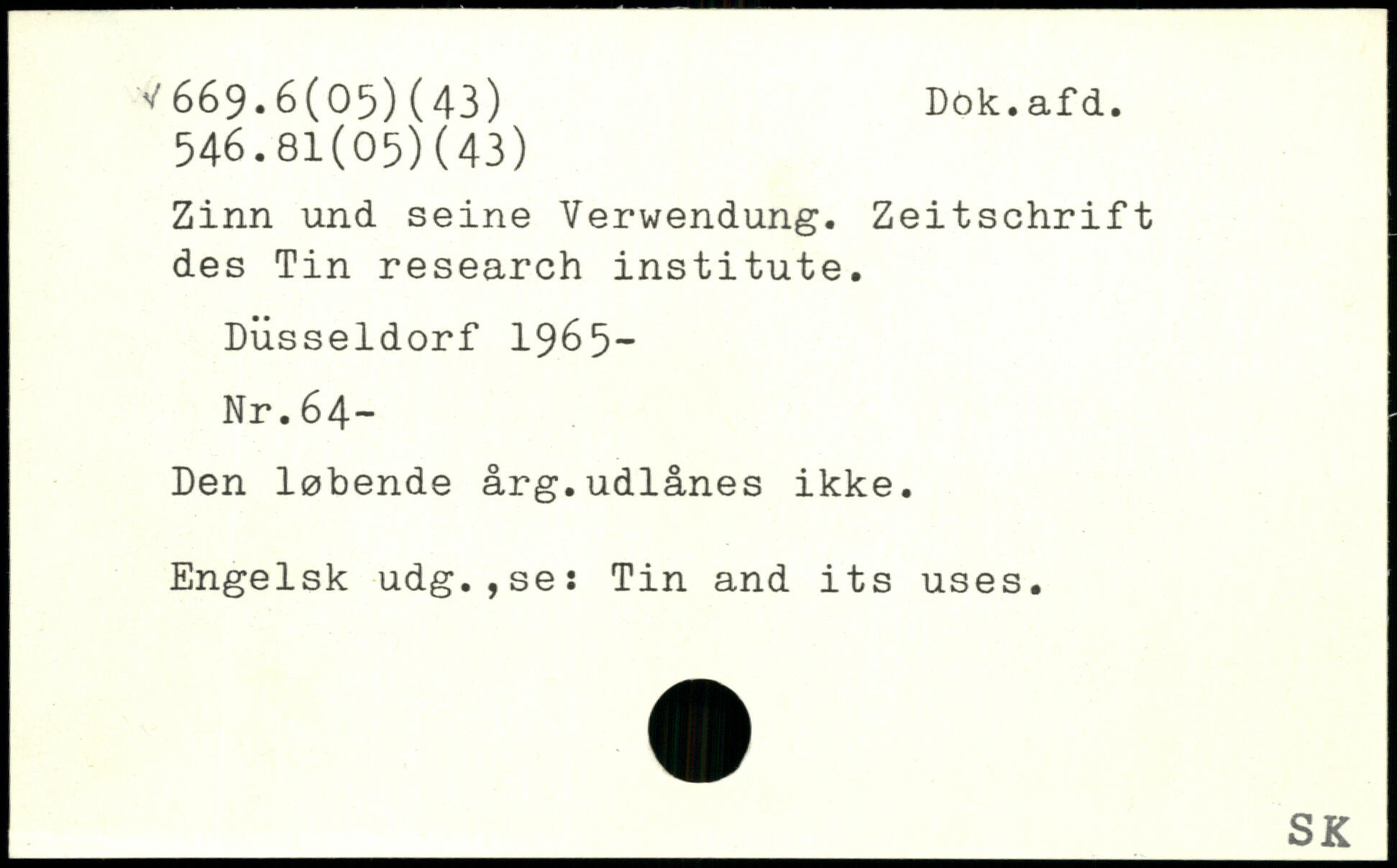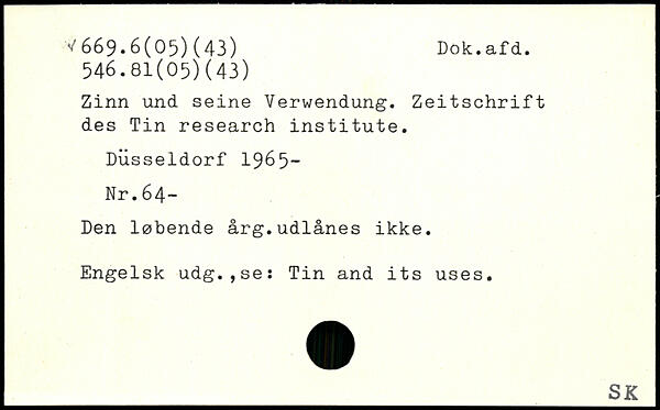 Zinn und seine Verwendung. Zeitschrift des Tin research institute. Düsseldorf 1965- Nr.64- Den løbende årg.udlånes ikke. Engelsk udg.,se: Tin and its uses.