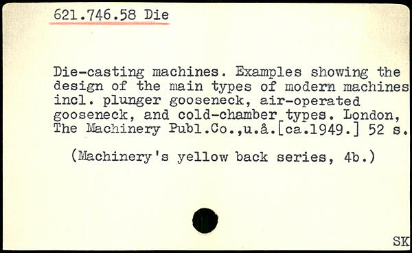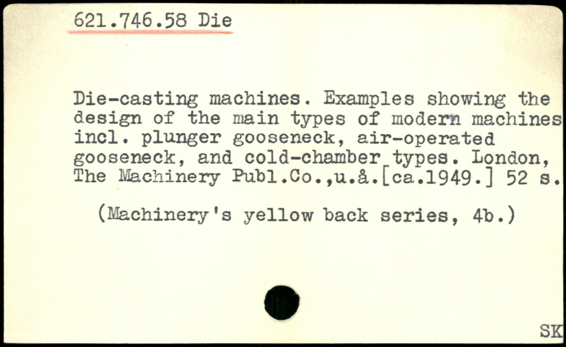 Die-casting machines. Examples showing the design of the main types of modem machines incl. plunger gooseneck, air-operated gooseneck, and cold-chamber types. London, The Machinery Publ.Co.,u.&.[ca.1949.]