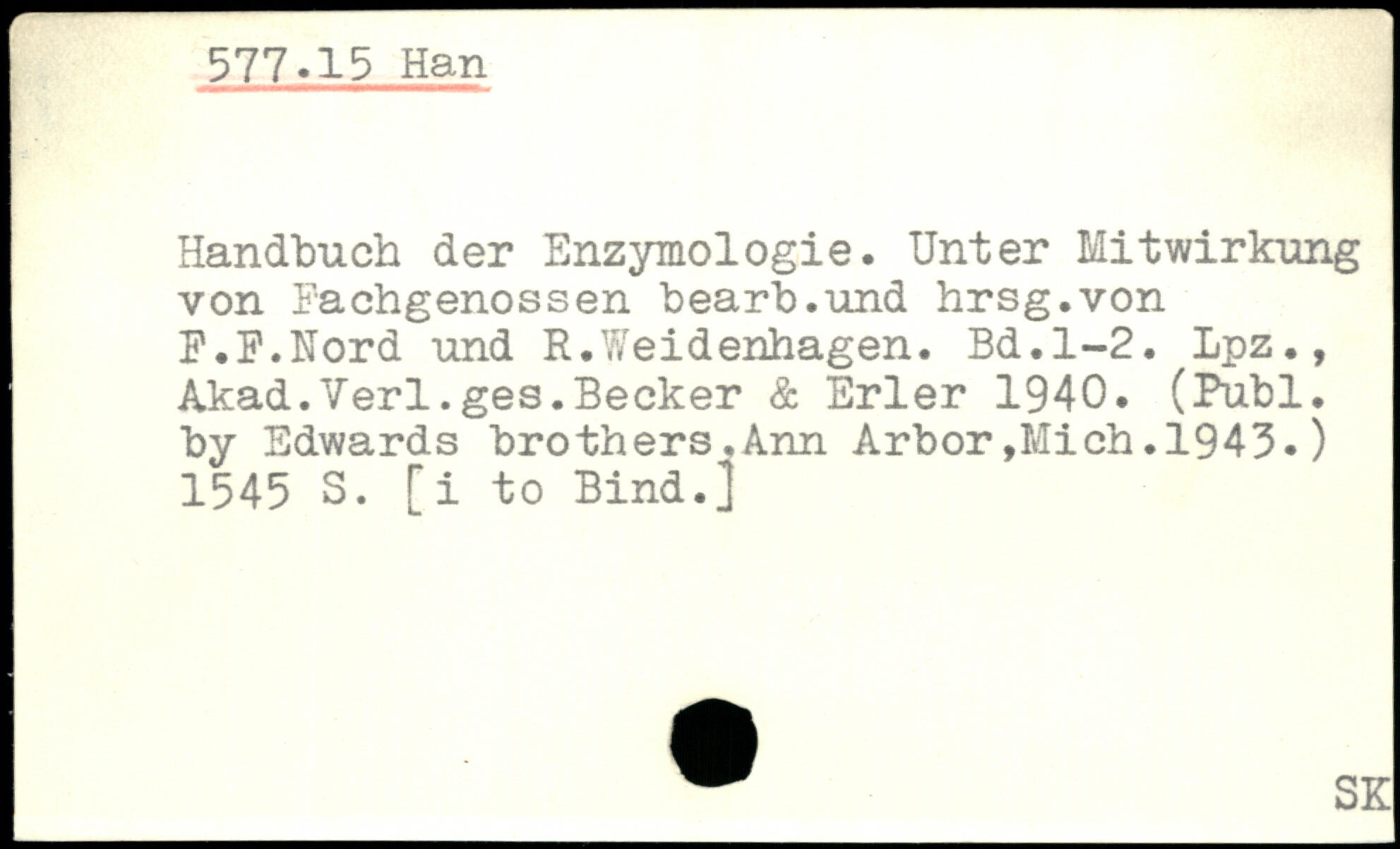 Handbuch der Enzymologie. Unter Hitwirkung von Fachgenossen bearb.und hrsg.von F.F.Nord und R.Weidenhagen.