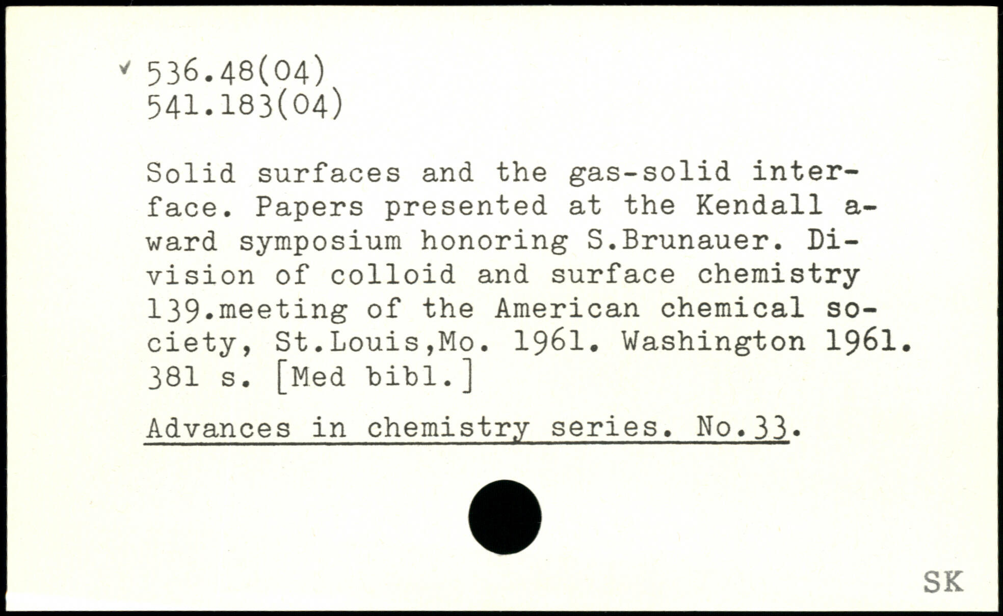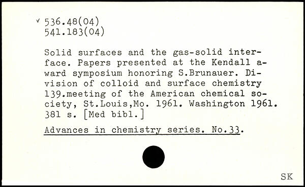 Solid surfaces and the gas-solid interface. Papers presented at the Kendall a-ward symposium honoring S.Brunauer. Division of colloid and surface chemistry 139.meeting of the American chemical society, St.Louis,Mo. 1961.