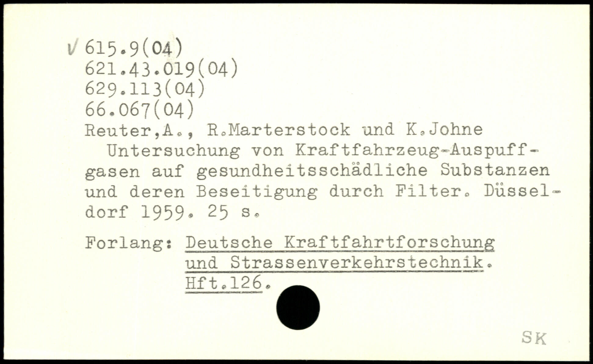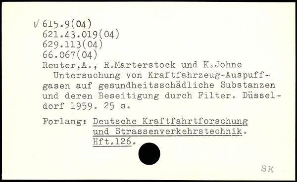 Reuter,Ac, RcMarterstock und K,Johne Untersuchung von Kraftfahrzeug-Auspuff-gasen auf gesundheitsschädliche Substanzen und deren Beseitigung durch Filter, Düsseldorf 1959.