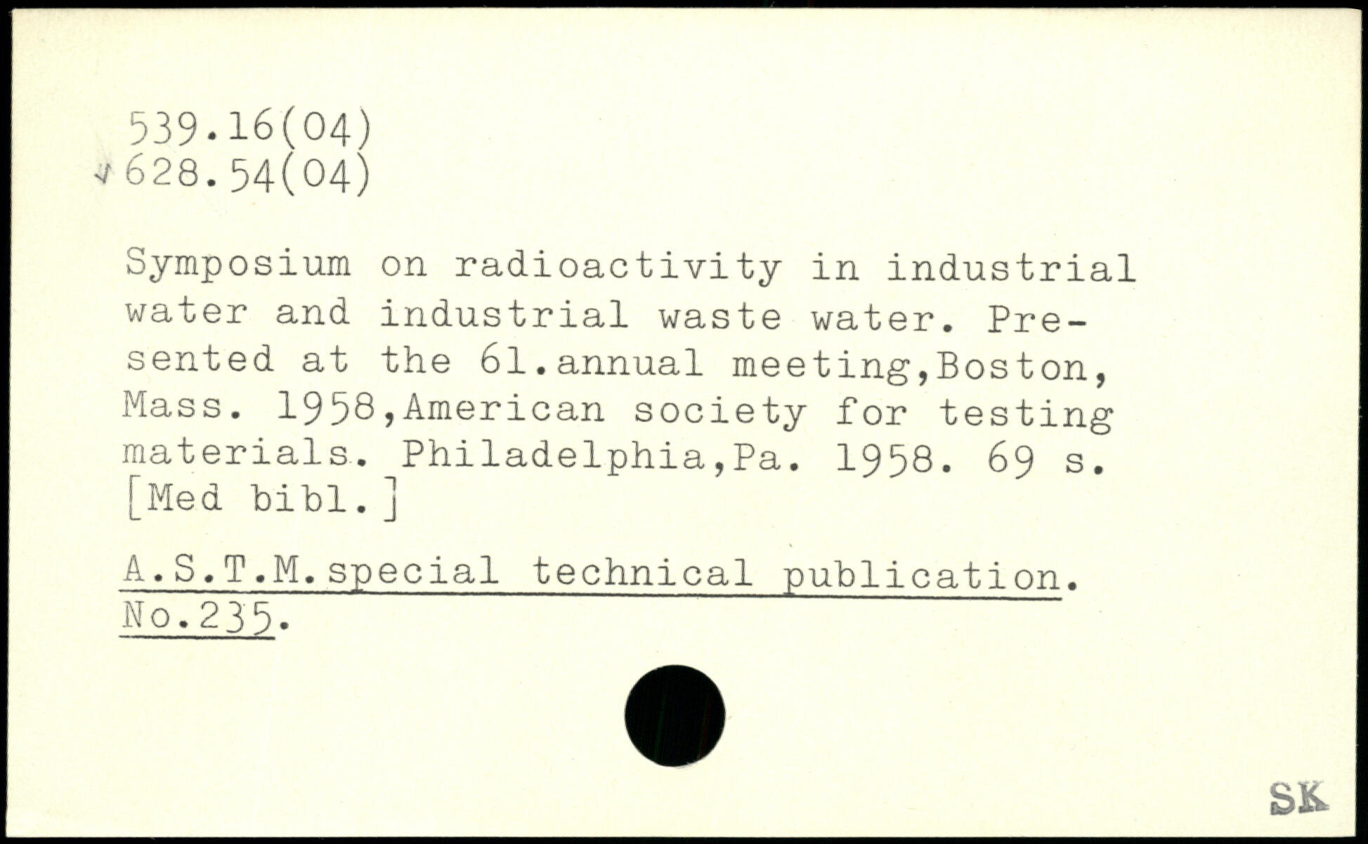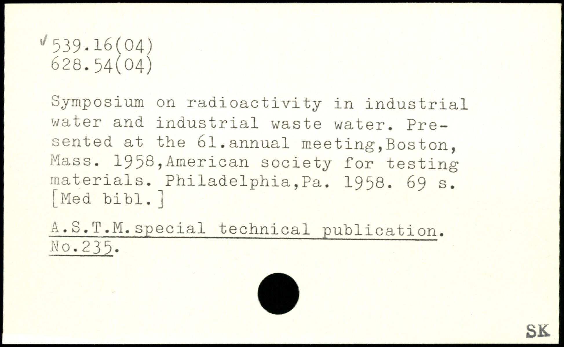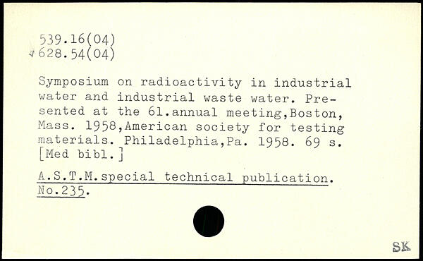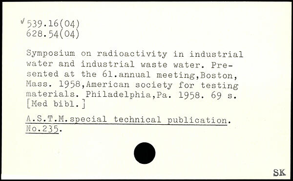 Symposium on radioactivity in industrial water and industrial waste water. Presented at the 61.annual meeting,Bos ton, Mass. 1958,American society for testing materials. Philadelphia,Pa. 1958.