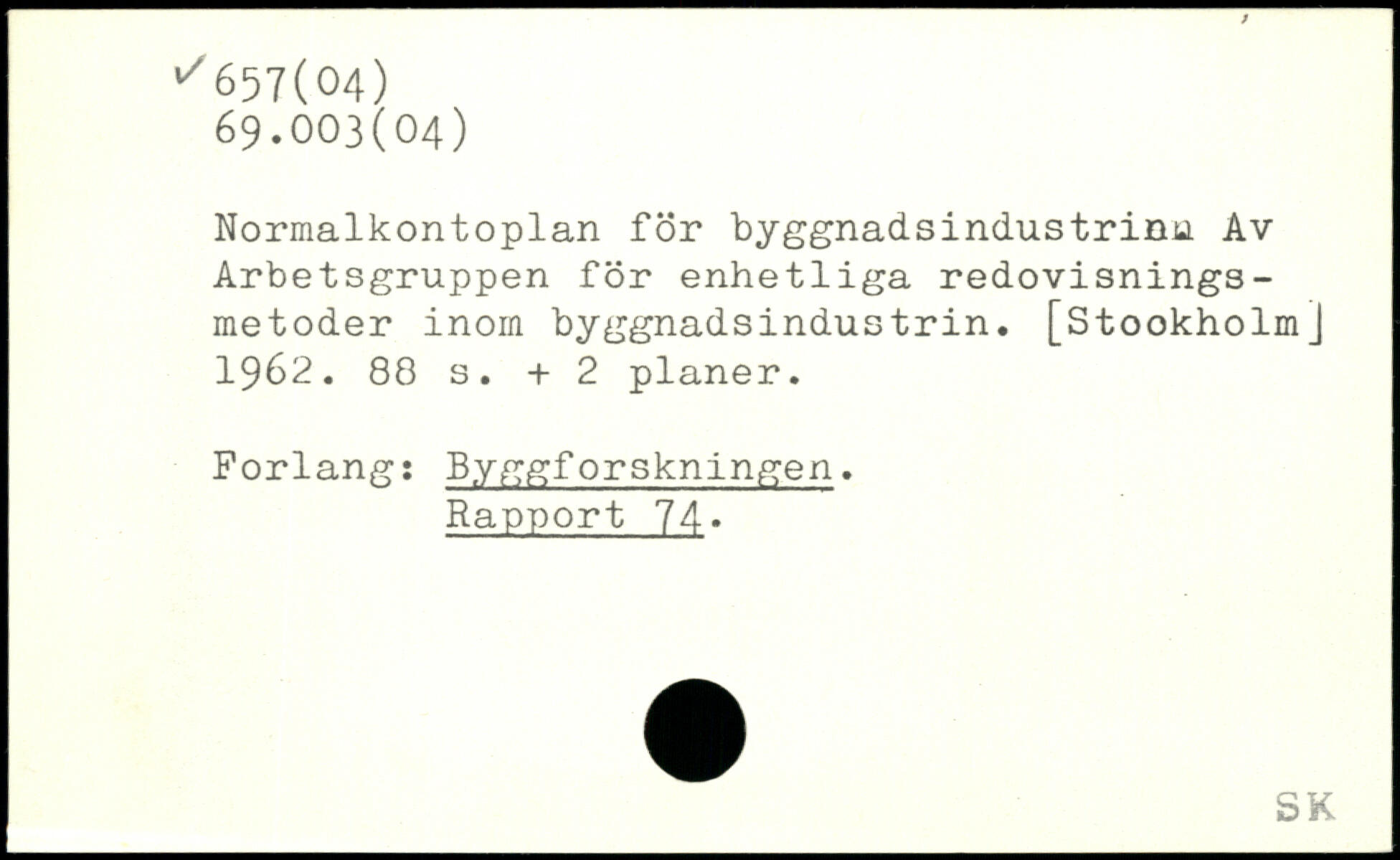 Normalkontoplan för byggnadsindustrinu Av Arbetsgruppen för enhetliga redovisnings -metoder inom byggnadsindustrin. [Stookholm] 1962.