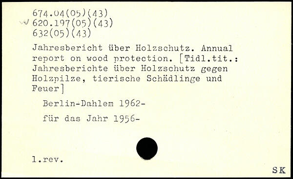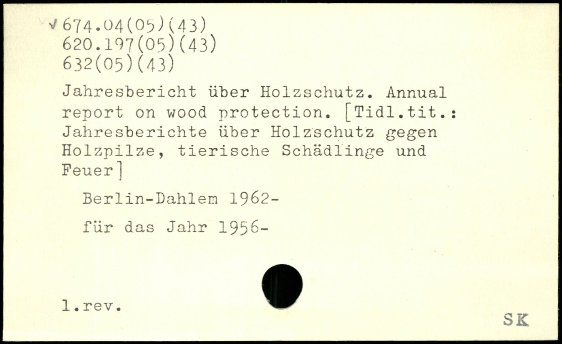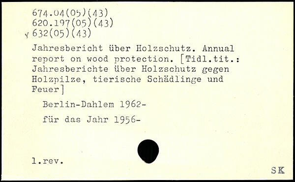 Jahresbericht über Holzschutz. Annual report on wood protection. [Tidl.tit.: Jahresberichte über Holzschutz gegen Holzpilze, tierische Schädlinge und Feuer] Berlin-Dahlem 1962-für das Jahr 1956-
