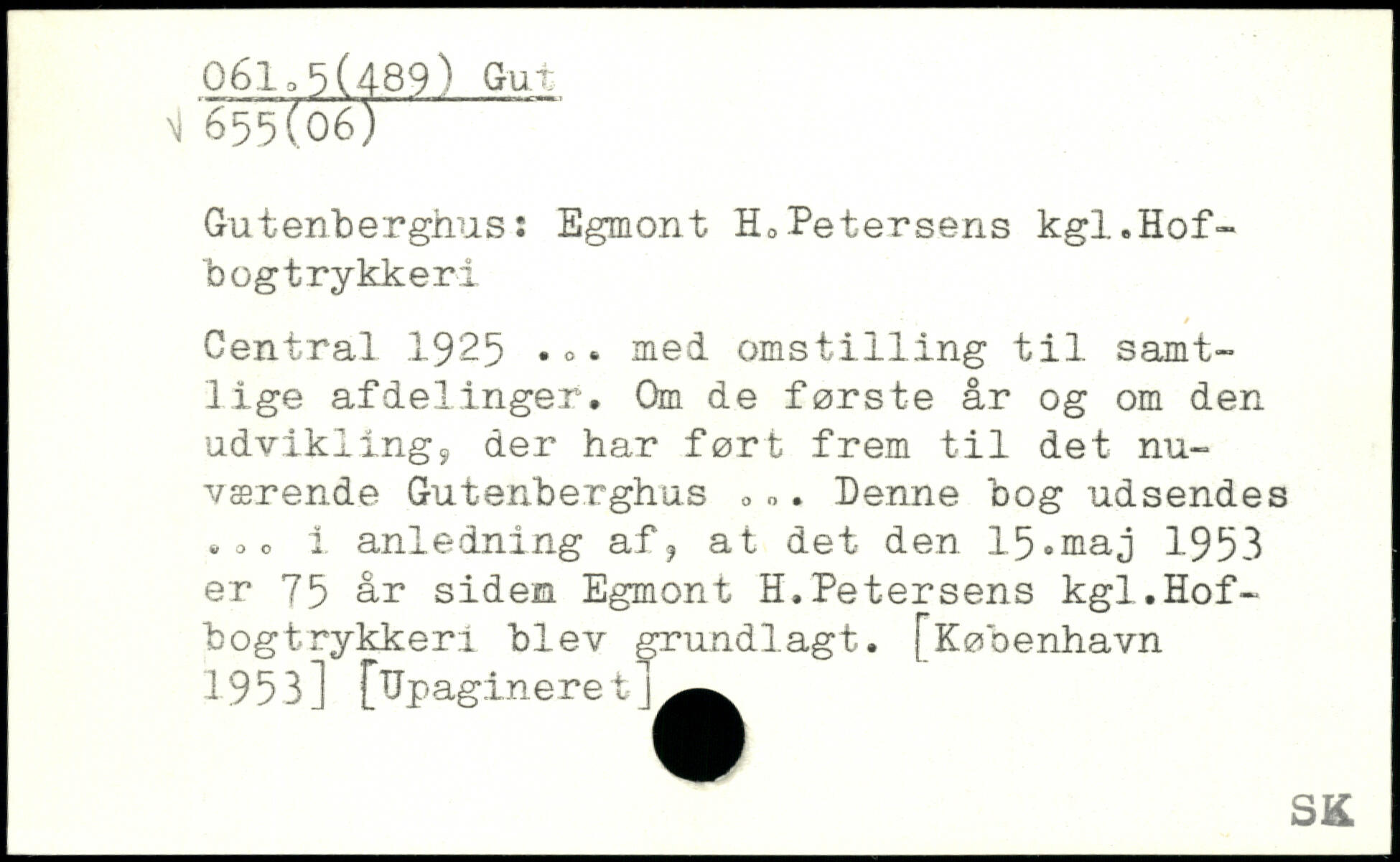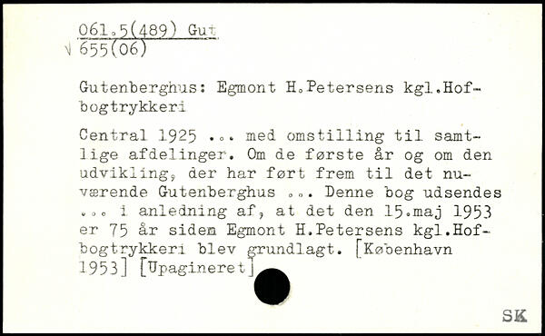 Gutenberghus: Egmont H, Petersens kgl.Hofbog trykkeri Central .1925. . . med omst1111ng til samtlige afdelinger. Om de første år og om den udvikling, der har ført frem til det nuværende Gutenberghus ,,. Denne bog udsendes .,o i anledning af, at det den 15.maj 1953 er 75 år siden Egmont H.Petersens kgl.Hofbog trykkeri blev grundlagt.