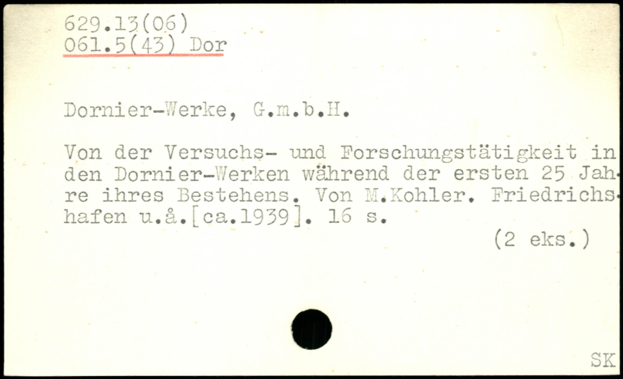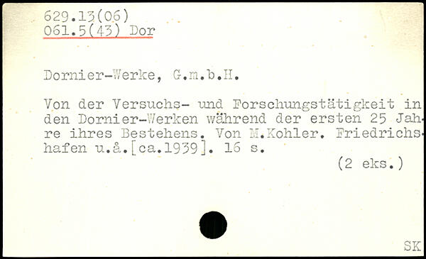 Dornier-Werke, G-.m.b.H. Von der Versuchs- und Forschungstätigkeit in den Dornier-Werken während der ersten 25 Jahre ihres Bestehens. Von M.Köhler. Friedrichshafen u.ä. [ca. 1959 j.