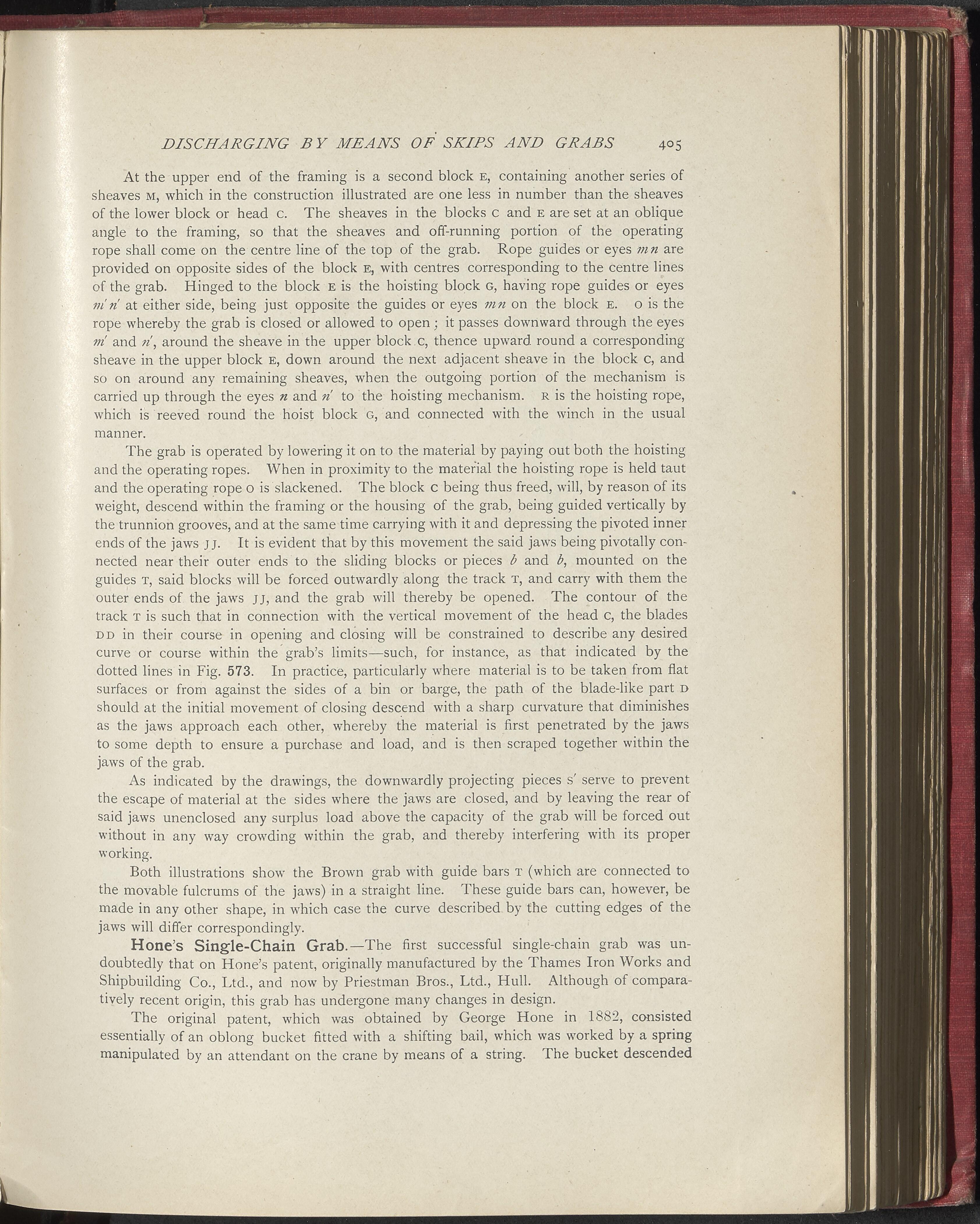 of the grab. Hinged to the block E is the hoisting block g, having rope guides or eyes