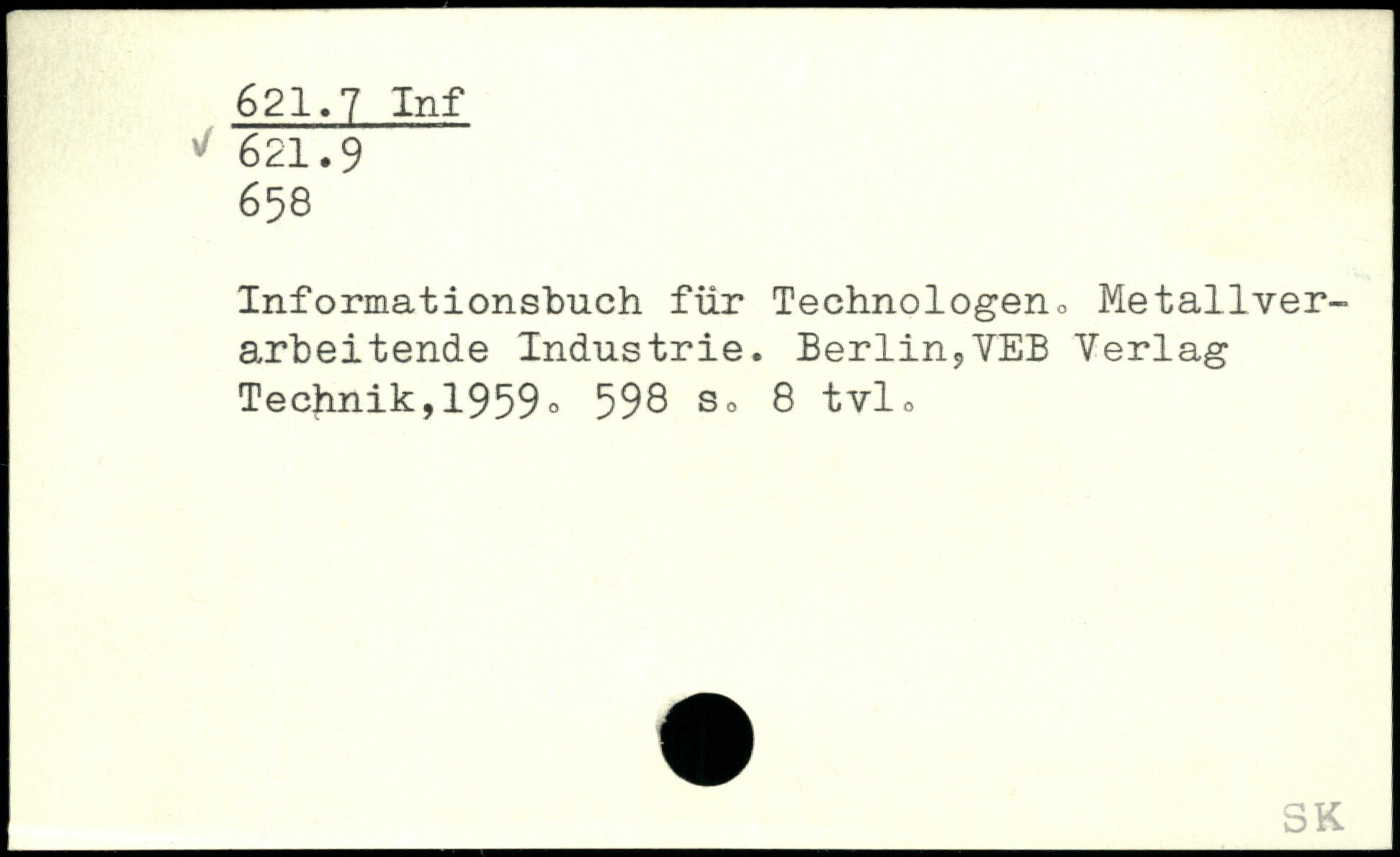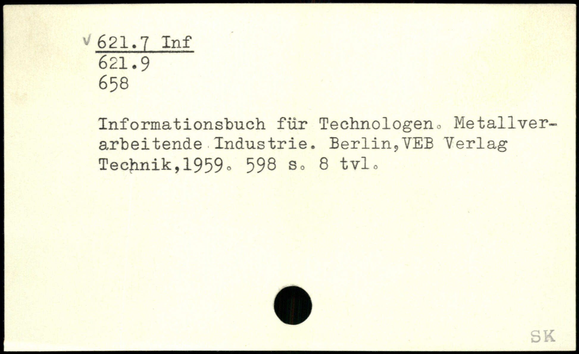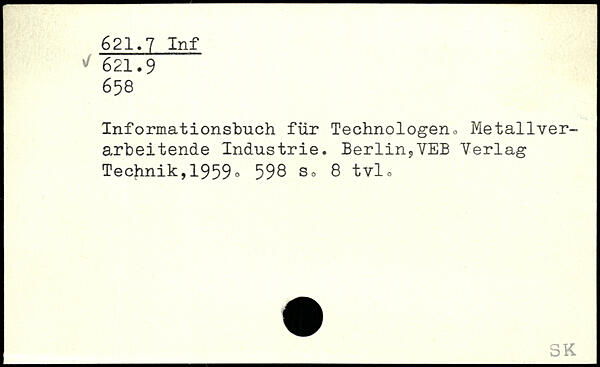 Informationsbuch für Technologen., Metallverarbeitende Industrie. Berlin,, VEB Verlag Technik,1959