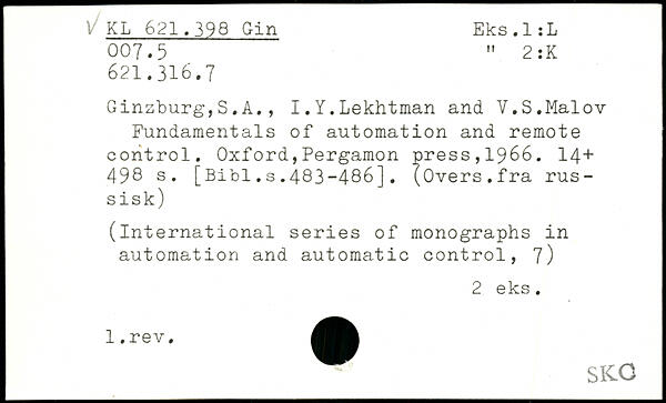 Ginzburg,S.A., I.Y.Lekhtman and V.S.Malov Fundamentals of automation and remote control.