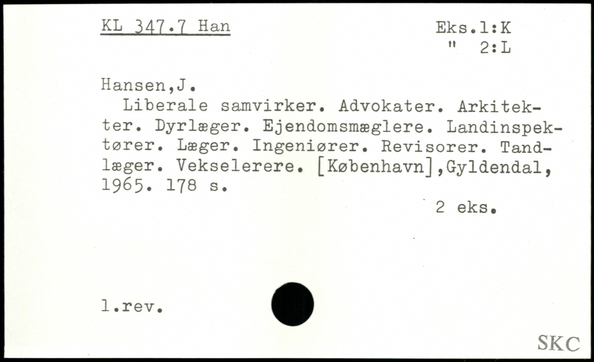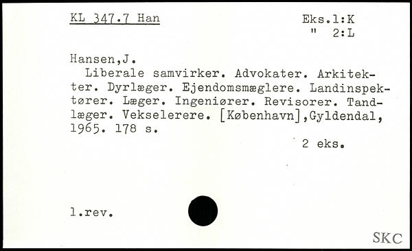 Liberale samvirker. Advokater. Arkitekter. Dyrlæger. Ejendomsmæglere. Landinspektører. Læger. Ingeniører. Revisorer. Tandlæger. Vekselerere. [København],Gyldendal, 1965