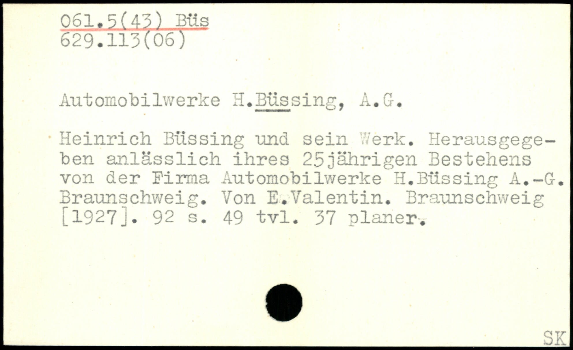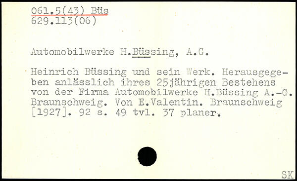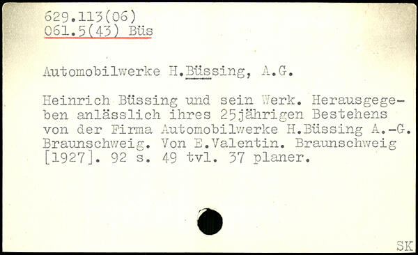 Automobilwerke H.Büssing, A.G. . Heinrich Büssing und sein Werk. Herausgegeben anlässlich ihres 25jährigen Bestehens von der Firma Automobilwerke H.Büssing A.-G-. Braunschweig. Von E.Valentin. Braunschweig [1927].