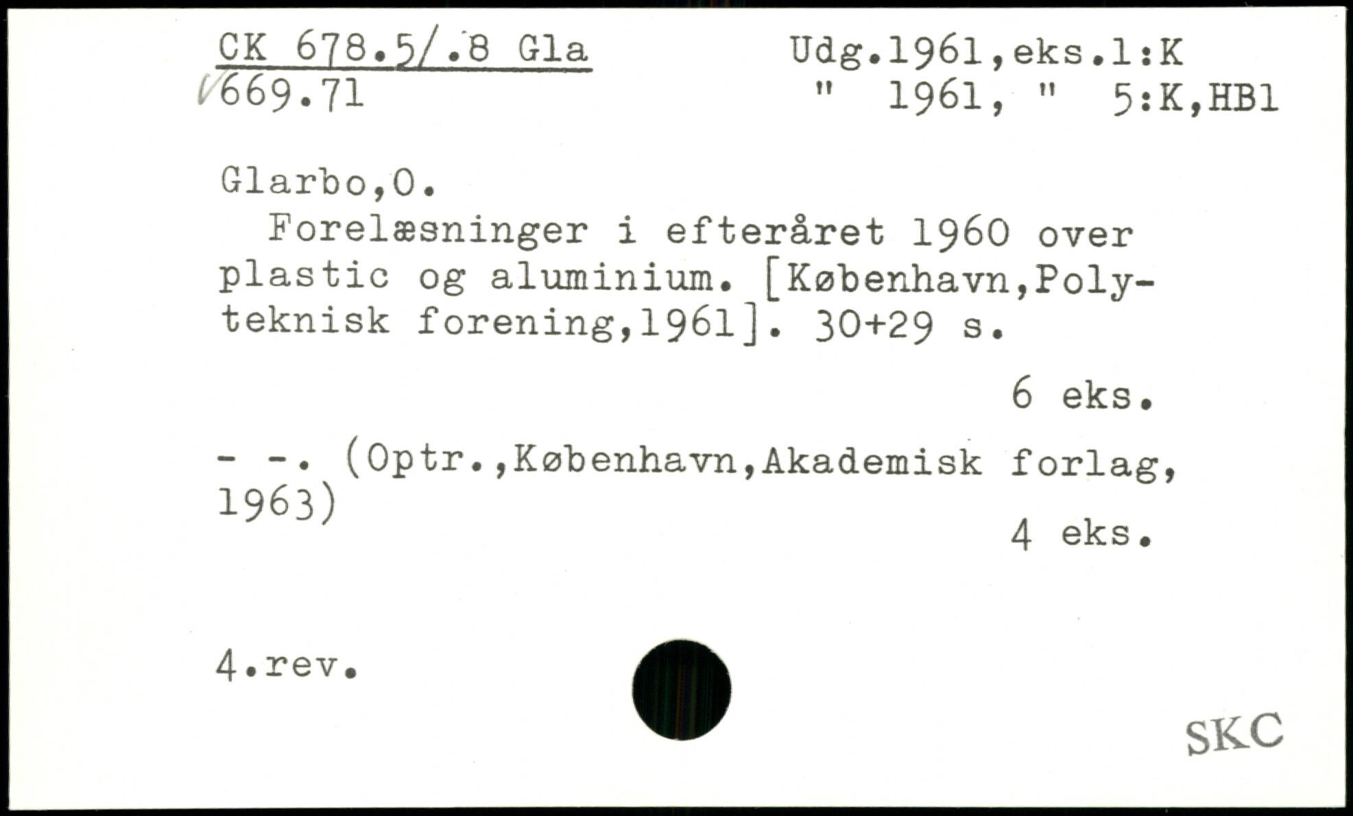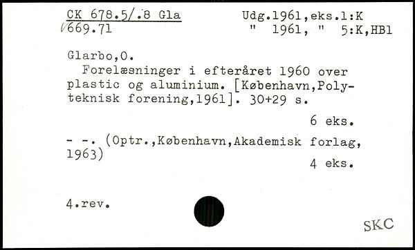 Forelæsninger i efteråret 1960 over plastic og aluminium.