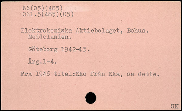 Elektrokemiska Aktiebolaget, Bohus. Meddelanden. Göteborg 1942-4 5. Årg.1-4. Era 1946 titel:Eko från Eka, se dette. _SK
