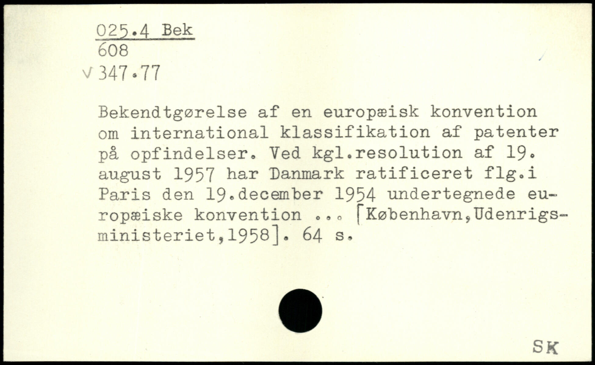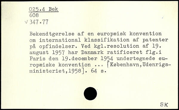 Bekendtgørelse af en europæisk konvention om international klassifikation af patenter på opfindelser. Ved kgl.resolution af 19, august 1957 har Danmark ratificeret flg.i Paris den 19,december 1954 undertegnede europæiske konvention <>. , ["København. Udenrigsministeriet ,1958].