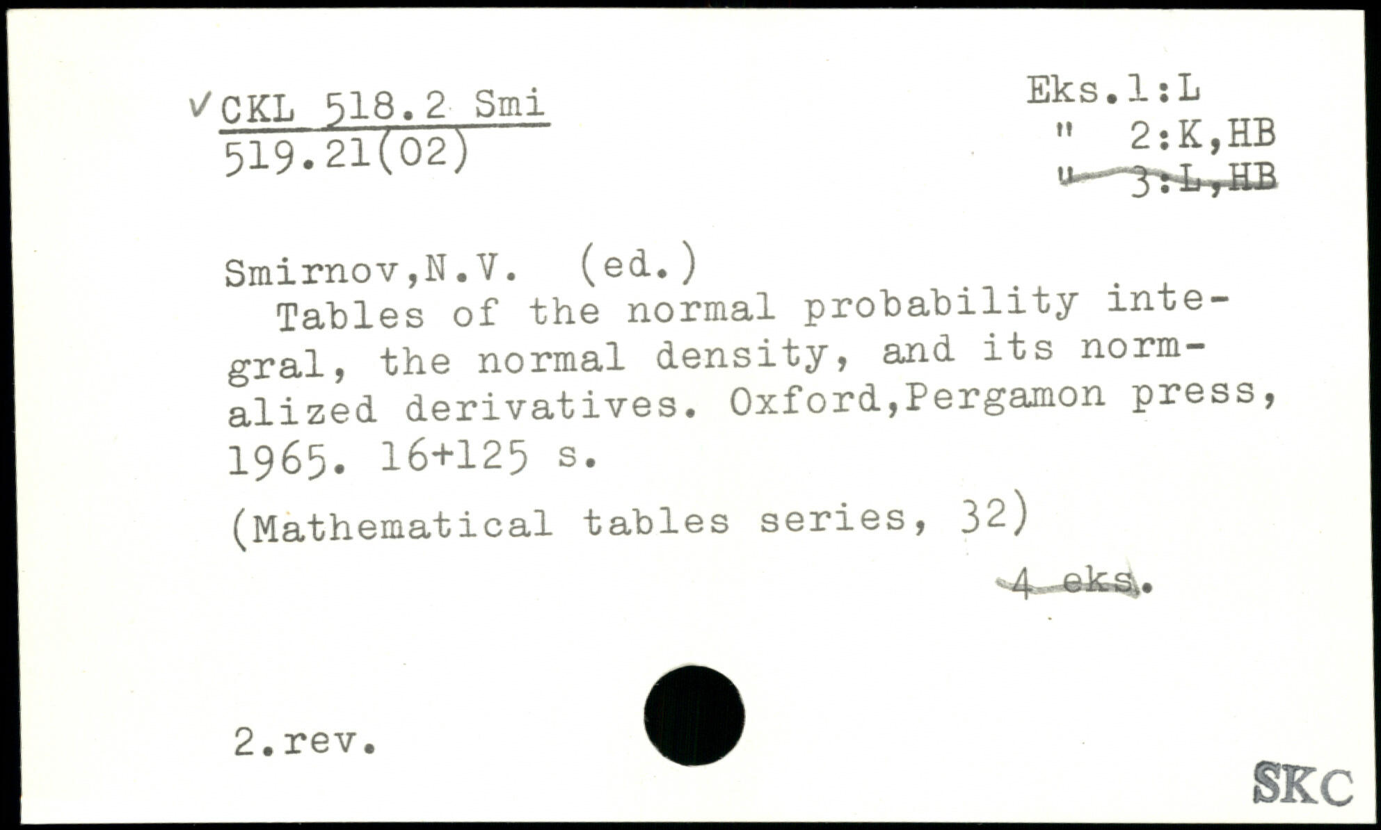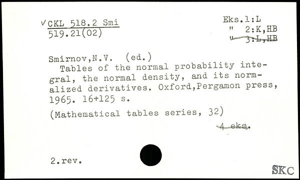 Smirnov,N.V. (ed.) ... Tables of the normal probability integral, the normal density, and its normalized derivatives.
