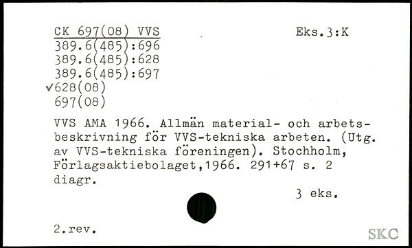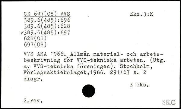 VVS AMA 1966. Allmän material- och arbetsbeskrivning för VVS-tekniska arbeten. (Utg. av VVS-tekniska föreningen). Stochholm, FÖrlagsaktiebolaget, 1 966.
