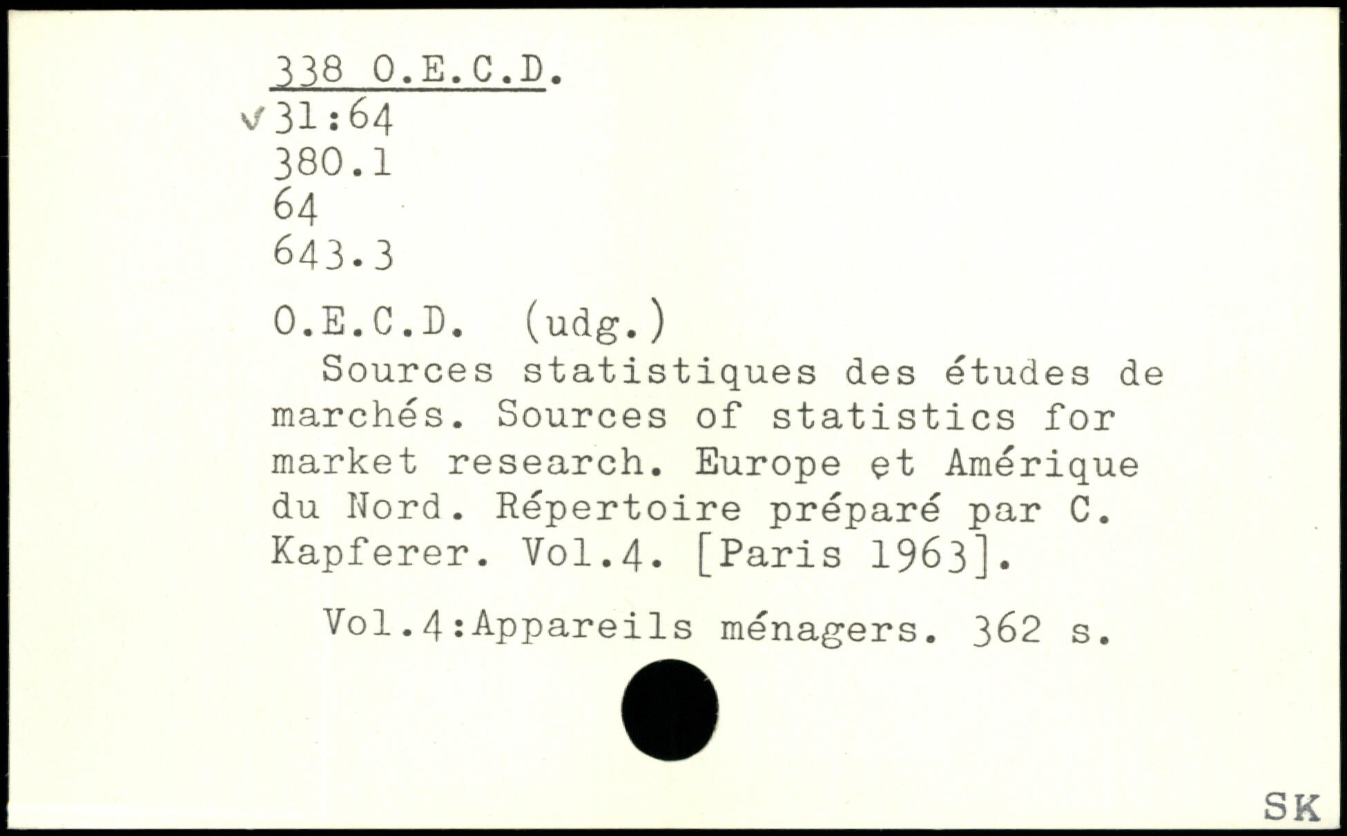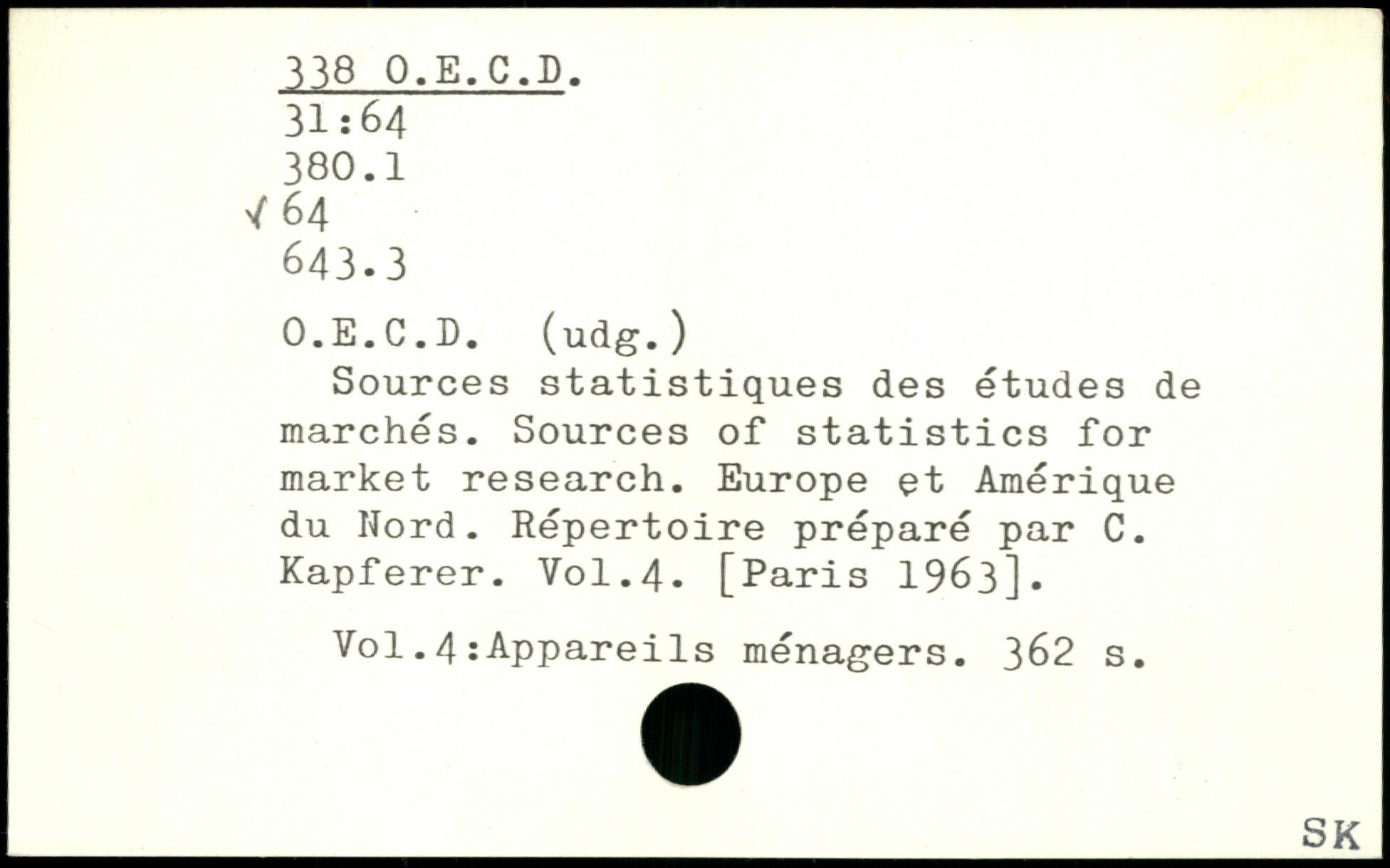 Sources statistiques des etudes de marches. Sources of statistics for market research. Europe et Amérique du Nord. Répertoire préparé par C. Kapferer.