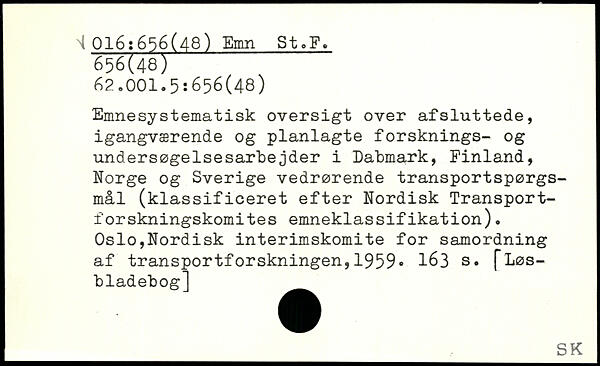 Emnesystematisk oversigt over afsluttede, igangværende og planlagte forsknings- og undersøgelsesarbejder i Dabmark, Finland, Norge og Sverige vedrørende transportspørgsmål (klassificeret efter Nordisk Transportforskningskomites emneklassifikation). Oslo,Nordisk interimskomite for samordning af transportforskningen, 1959