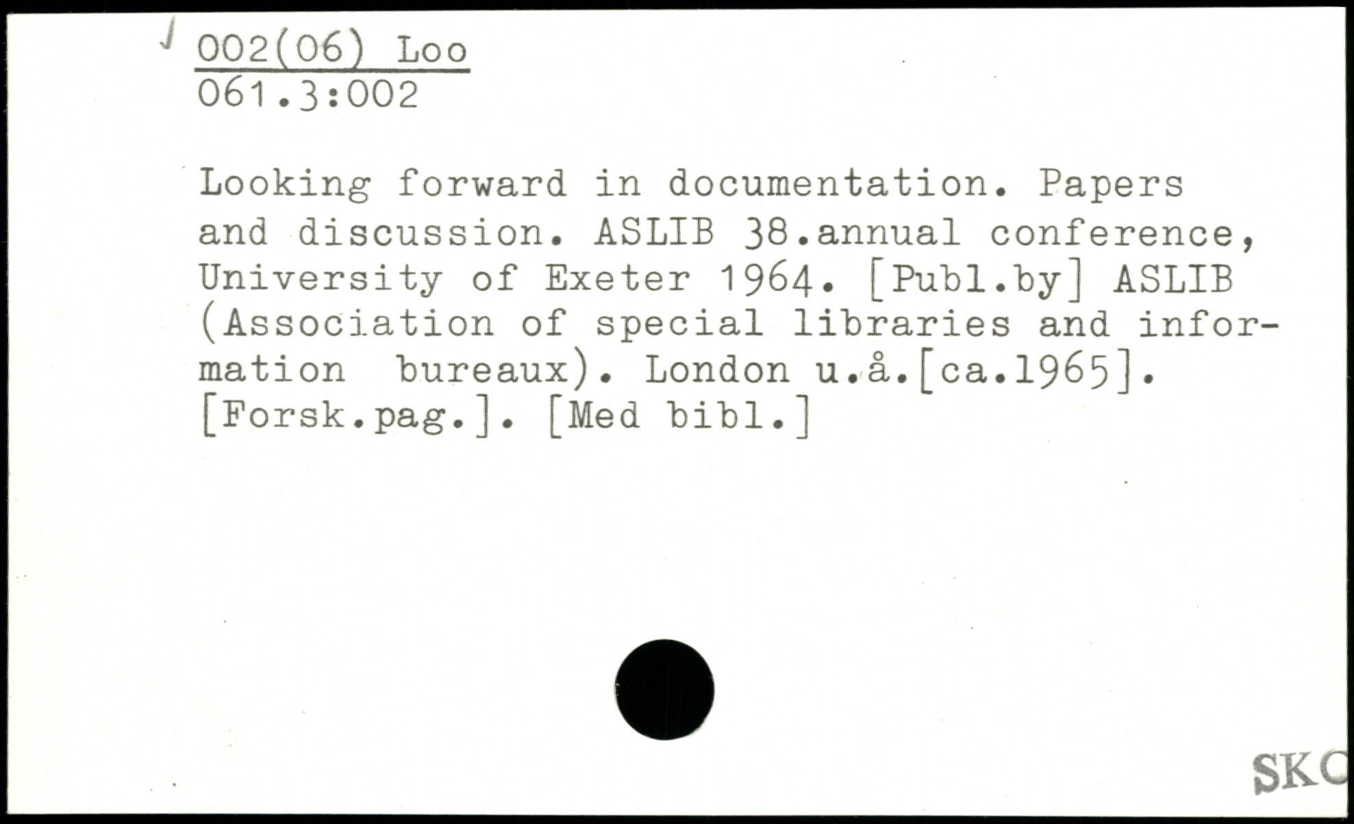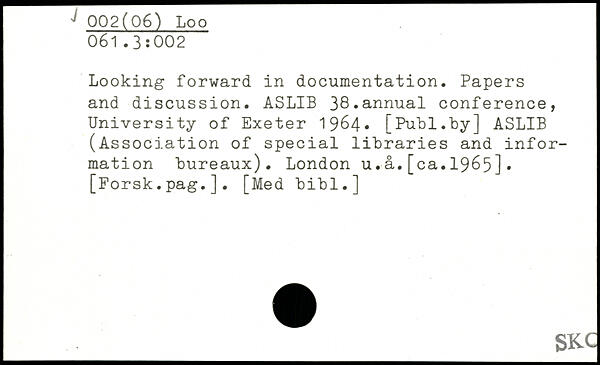 Looking forward in documentation. Papers and discussion. ASLIB 38.annual conference, University of Exeter 1964. [Publ.Uy] ASLIB (Association of special libraries and information Bureaux). London u.a.[ca.1965].