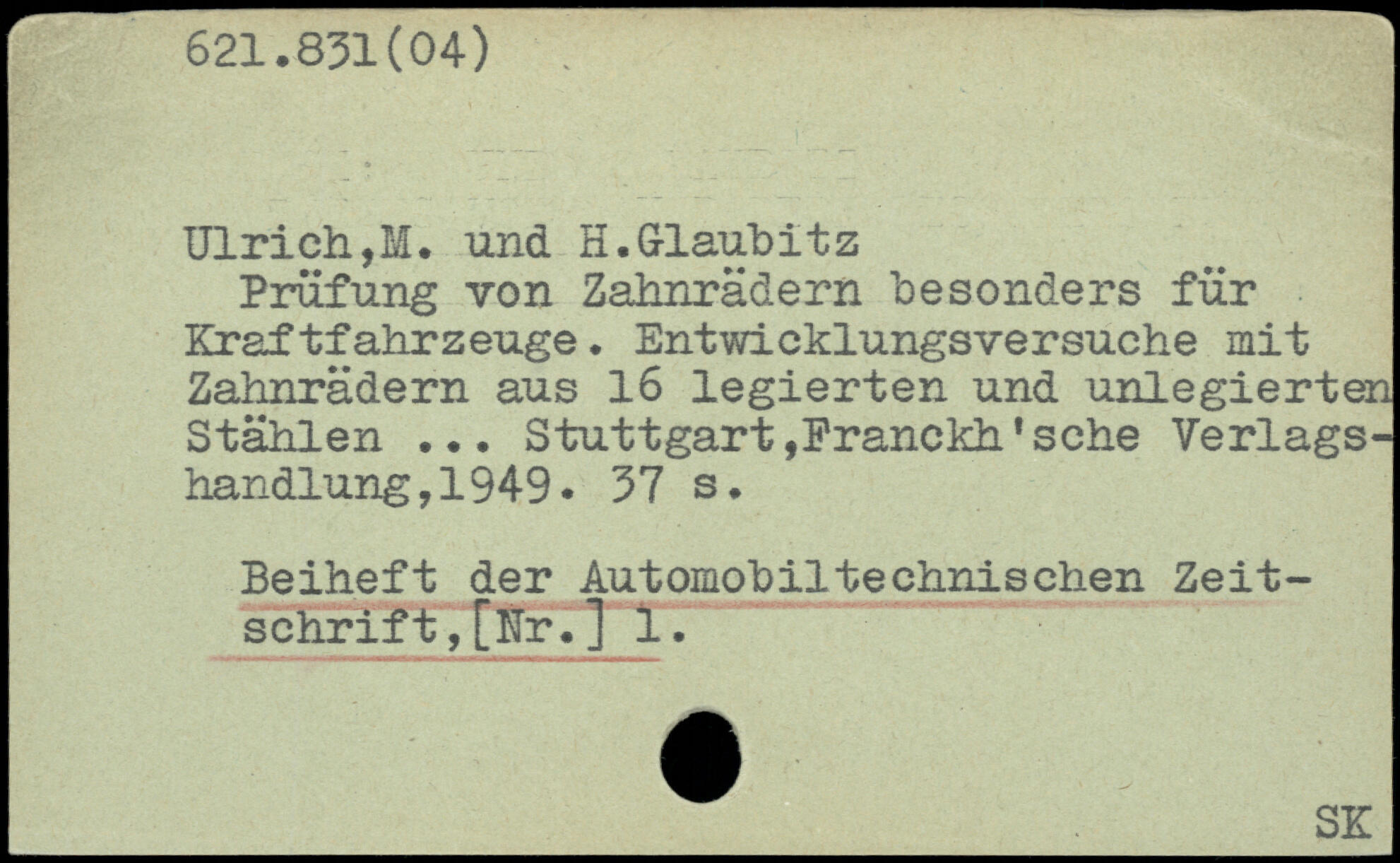 Prüfung von Zahnrädern besonders für Kraftfahrzeuge. Entwicklungsversuche mit Zahnrädern aus 16 legierten und unlegierten Stählen ... Stuttgart,Franckh'sehe Verlagshandlung, 1949.