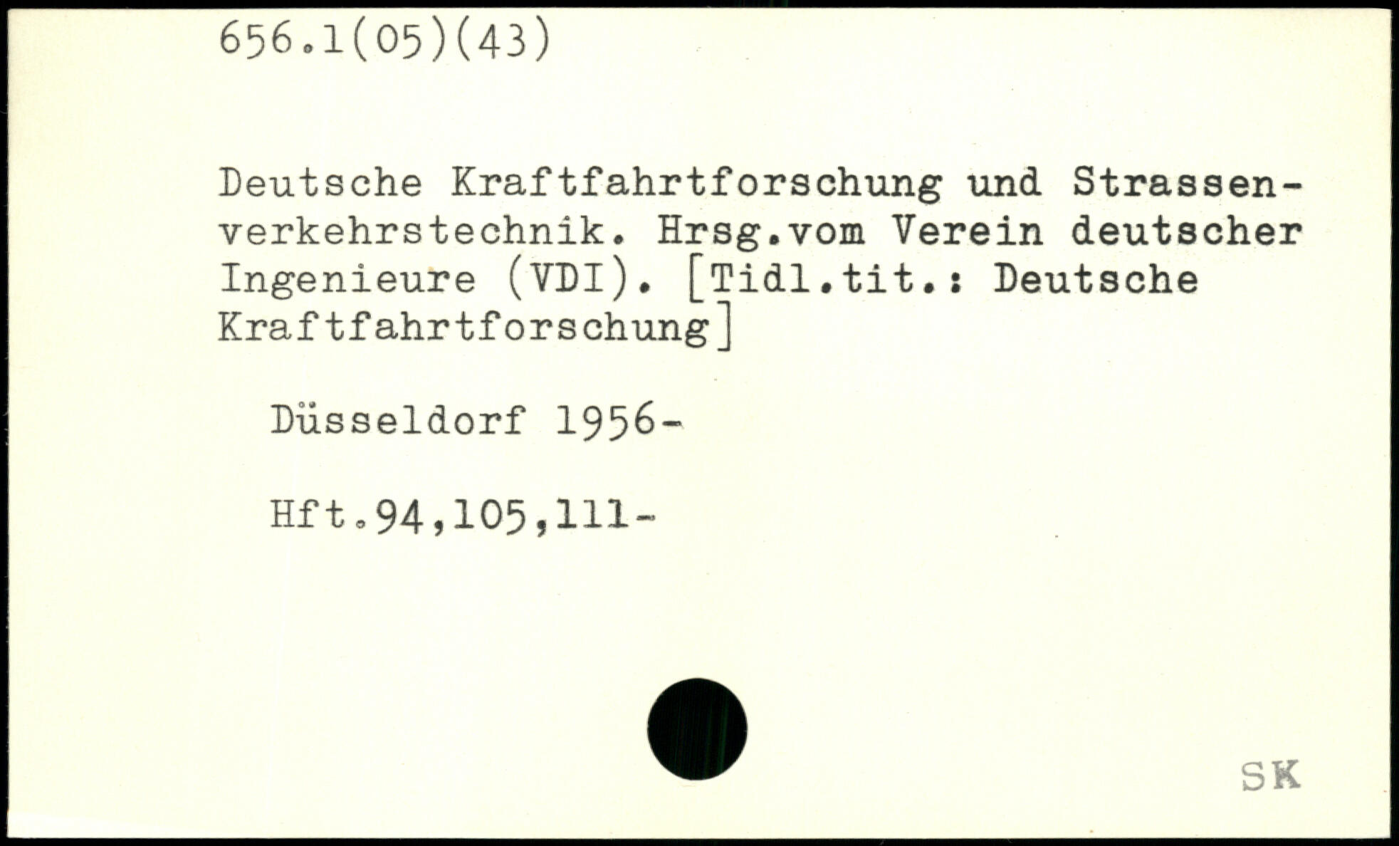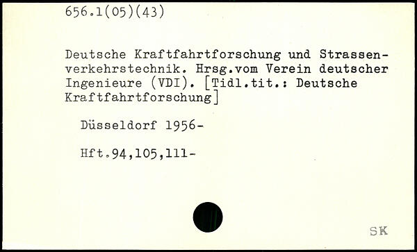 Deutsche Kraftfahrtforschung und Strassen-verkehrstechnik. Hrsg.vom Verein deutscher Ingenieure (VDl). [Tidl.tit.: Deutsche Kraftfahrtforschung] Düsseldorf 195&- Hft.94,105,111”