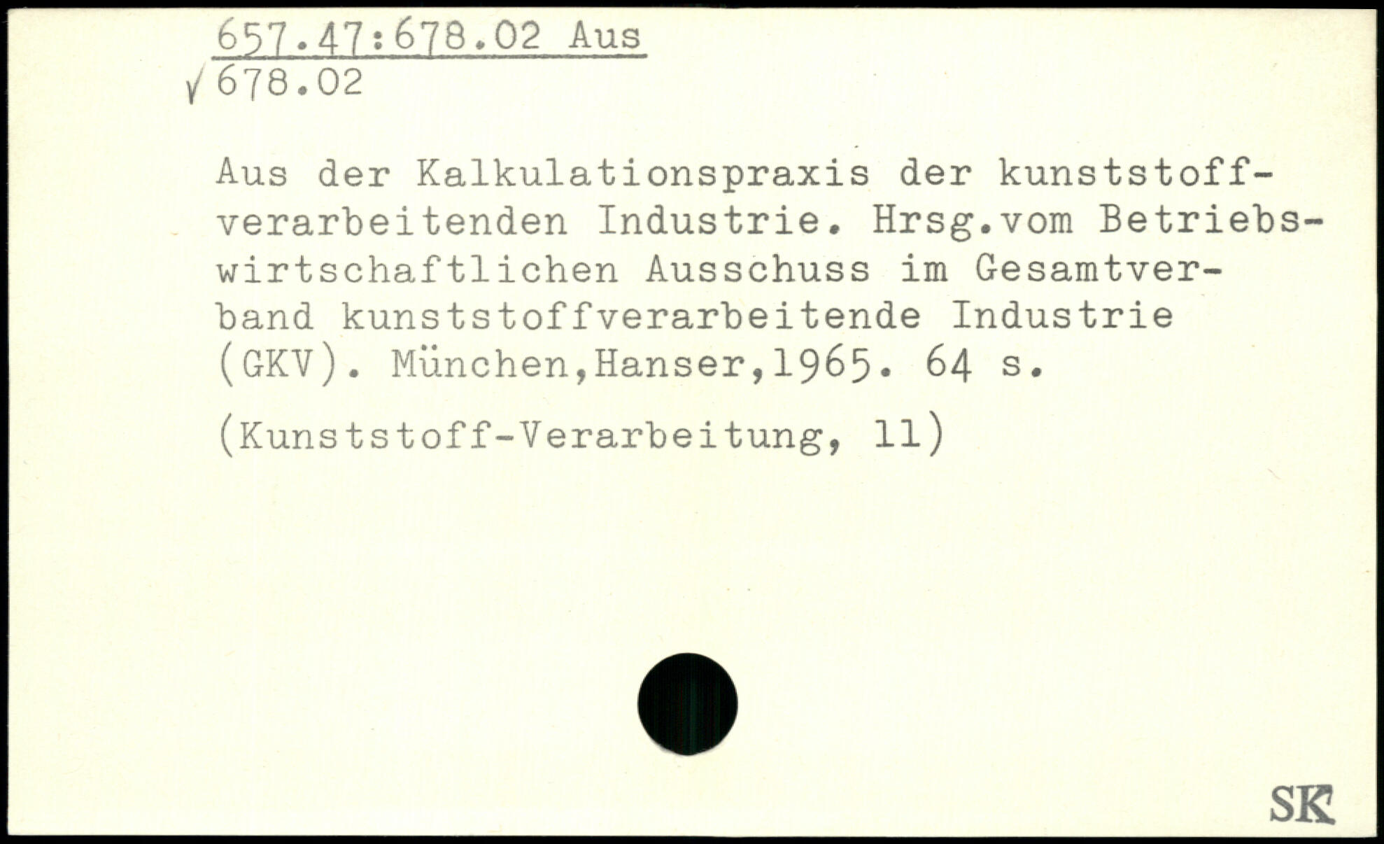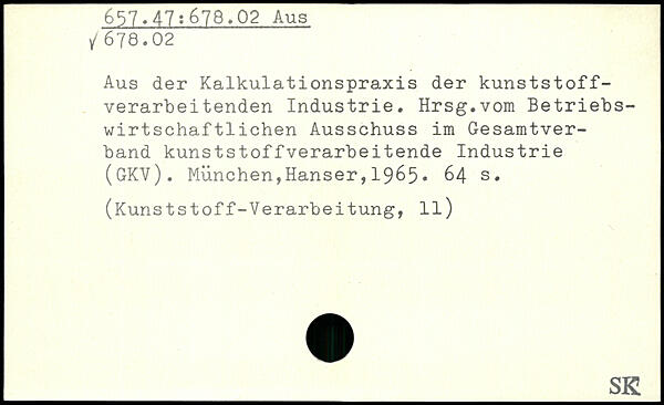 Aus der Kalkulationspraxis der kunststoffverarbeitenden Industrie. Hrsg.vom Betriebswirtschaftlichen Ausschuss im Gesamtverband kunststoffverarbeitende Industrie (GRY).