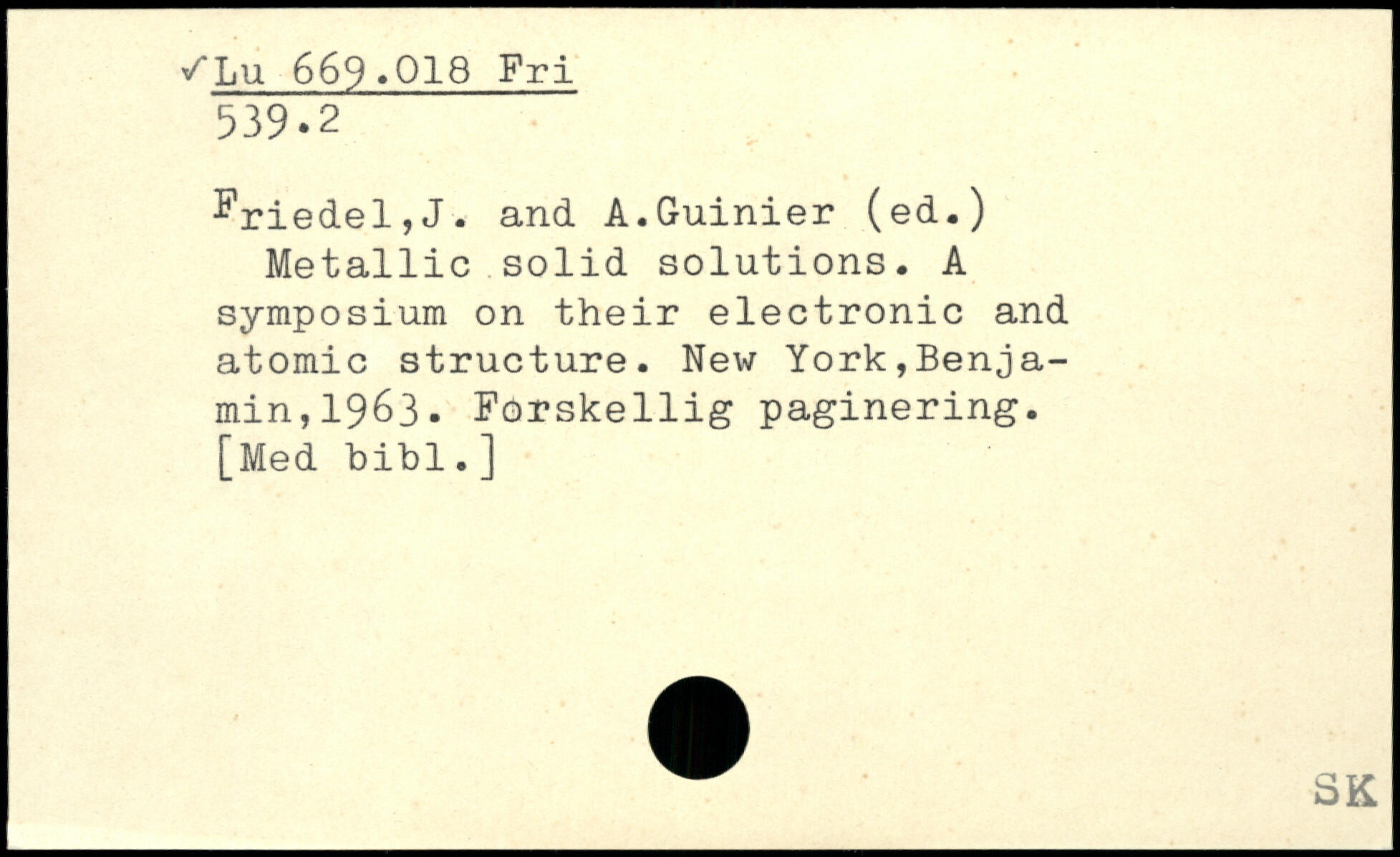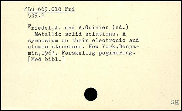 ^riedel,J. and A.Guinier (ed.) Metallic solid solutions. A symposium on their electronic and atomic structure.