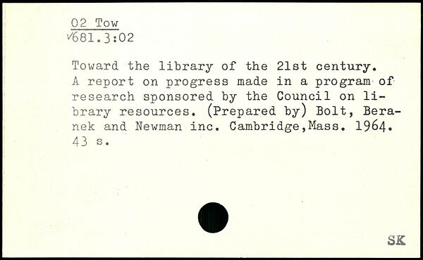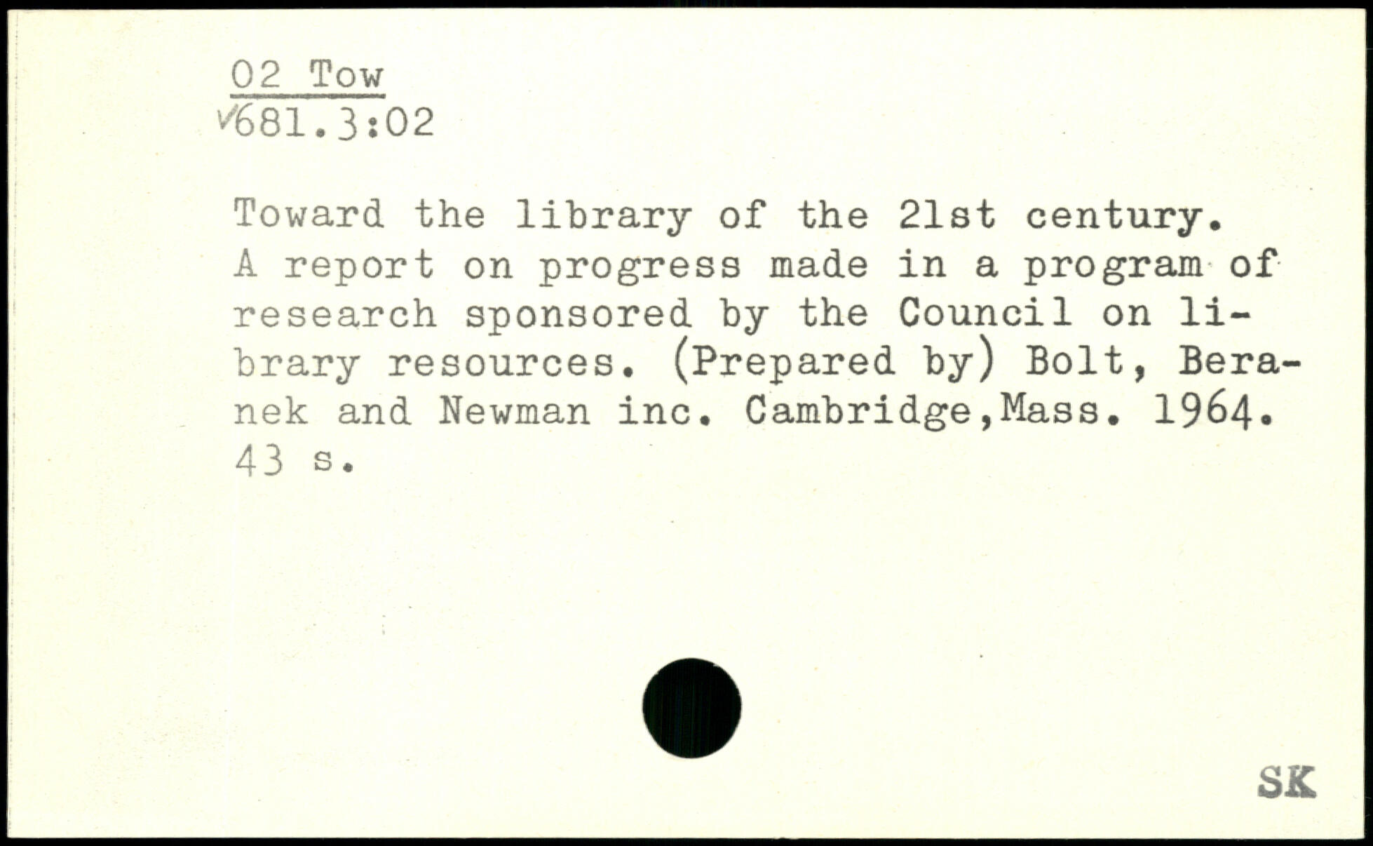 Toward the library of the 21st century. A report on progress made in a program of research sponsored by the Council on library resources. (Prepared by) Bolt, Bera-nek and Newman inc. Cambridge,Mass. 19&4.