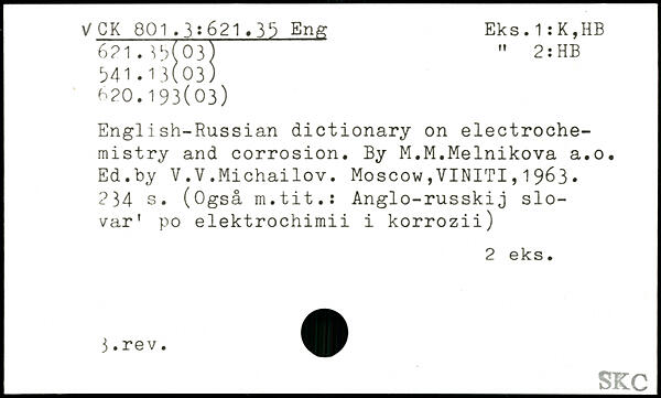 Engl ish-Russian dictionary on electrochemistry and corrosion. By M.M.Melnikova a.o. Ed.by V.V.Michailov.