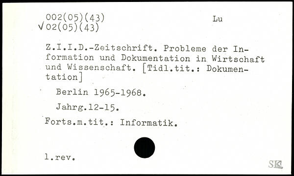 Z.I.I.D.-Zeitschrift. Probleme der Information und Dokumentation in Wirtschaft und Wissenschaft. [Tidl.tit.: Dokumentation]