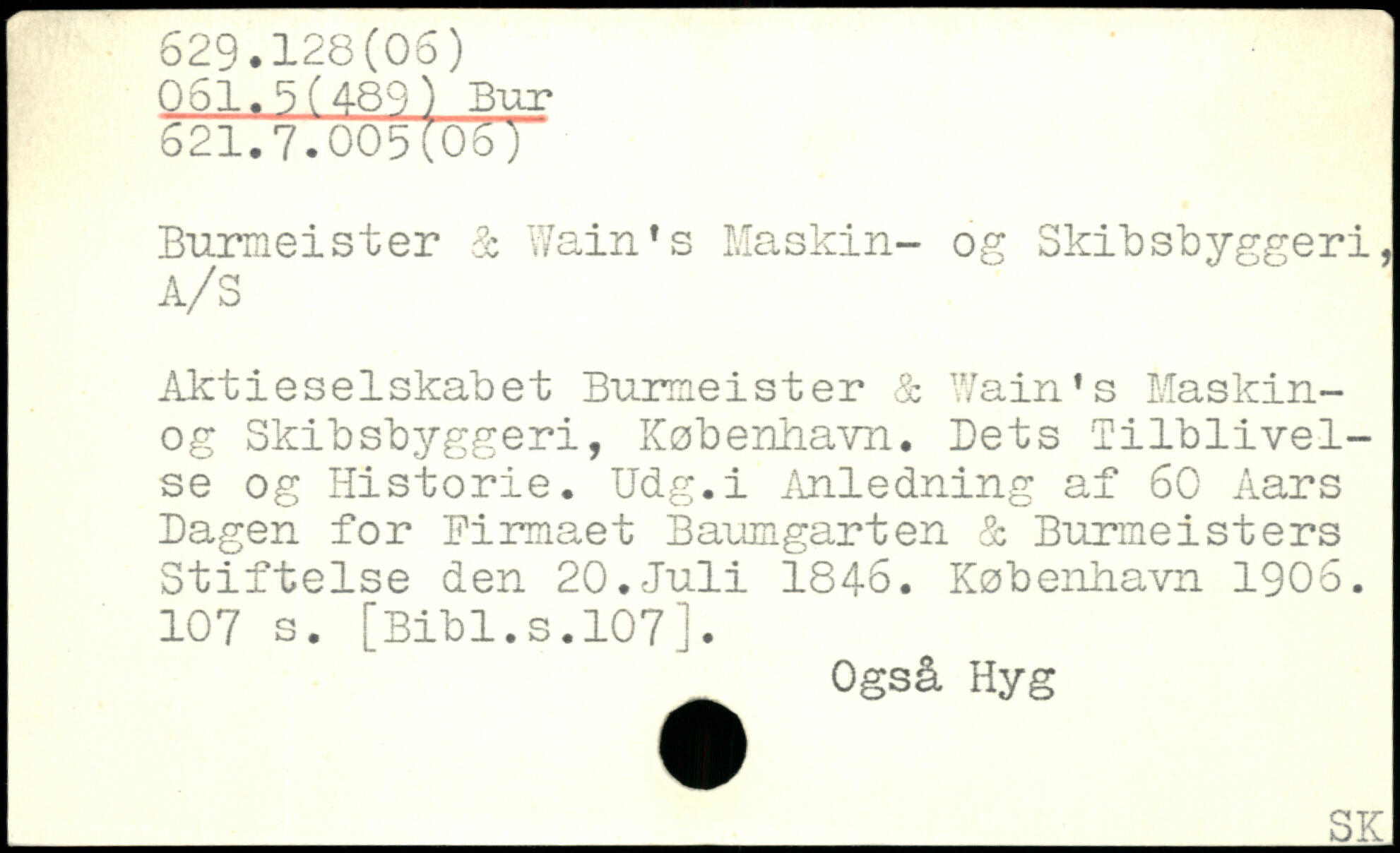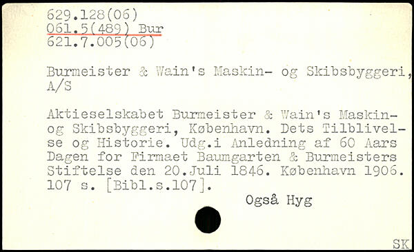 Burmeister i V/ain's Maskin- og Skibsbyggeri, Aktieselskabet Burmeister & Wain's Maskin-og Skibsbyggeri, København. Dets Tilblivelse og Historie. Udg.i Anledning af 60 Aars Bagen for firmaet Baumgarten & Burmeisters Stiftelse den 20.Juli 1846.