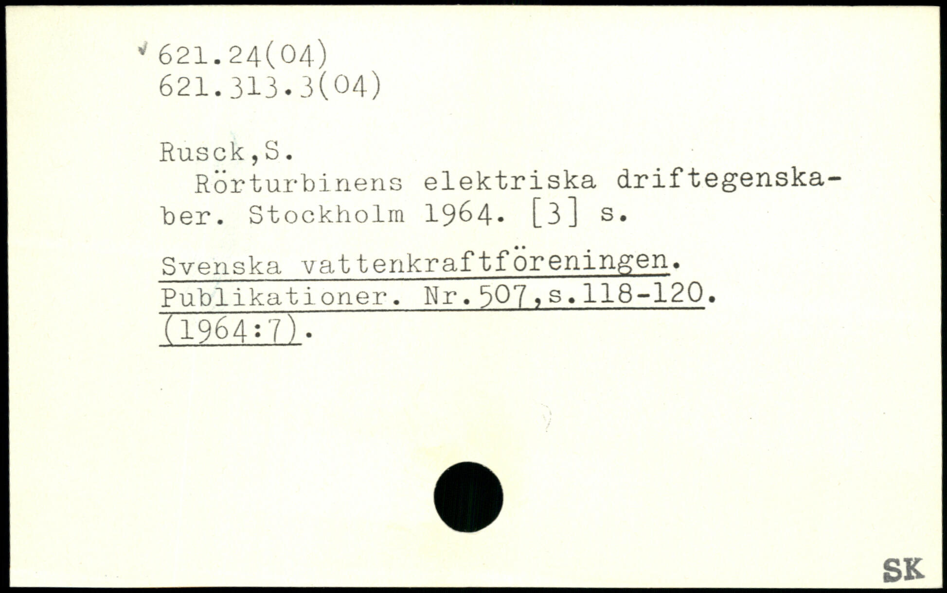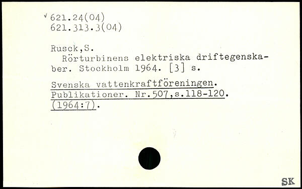 Rörturbinens elektriska driftegenska-ber. Stockholm 19&4. [3] s. Svenska vattenkraftföreningen. Publikationer. Nr.607 ,s.118-120. (1964=7)-