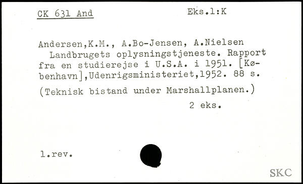 Andersen,K.M., A.Bo-Jensen, A.Nielsen Landbrugets oplysningstjeneste. Rapport fra en studierejse i U.S.A. i 1951, [København] ,Udenrigsministeriet , 1952.