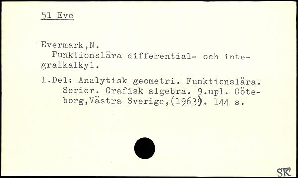 Funktionslära differential- och integralkalkyl. 1.Deli Analytisk geometri. Funktionslära. Serier. Grafisk algebra. 9.upl. Göteborg,Västra Sverige,(1963J.