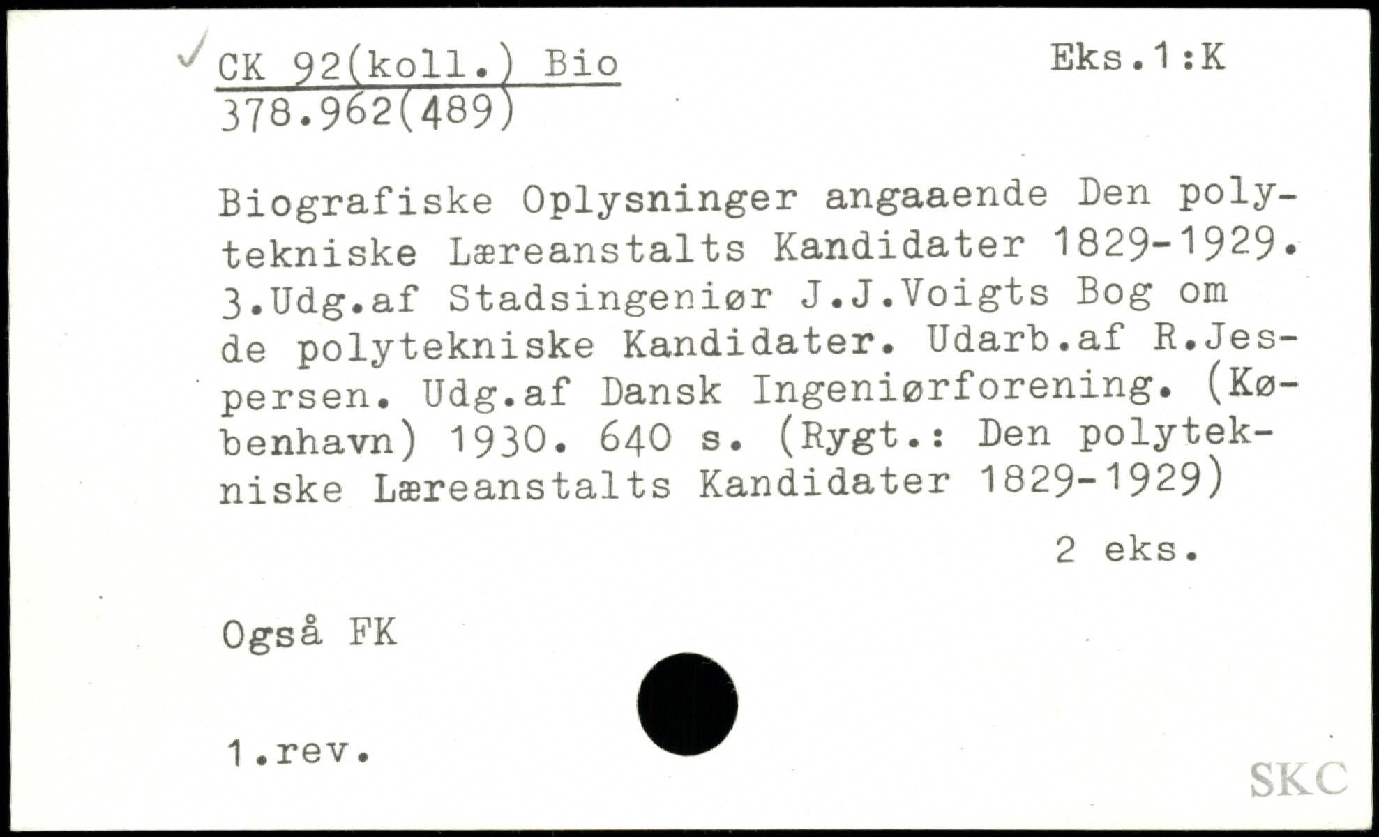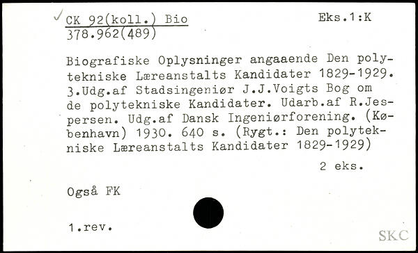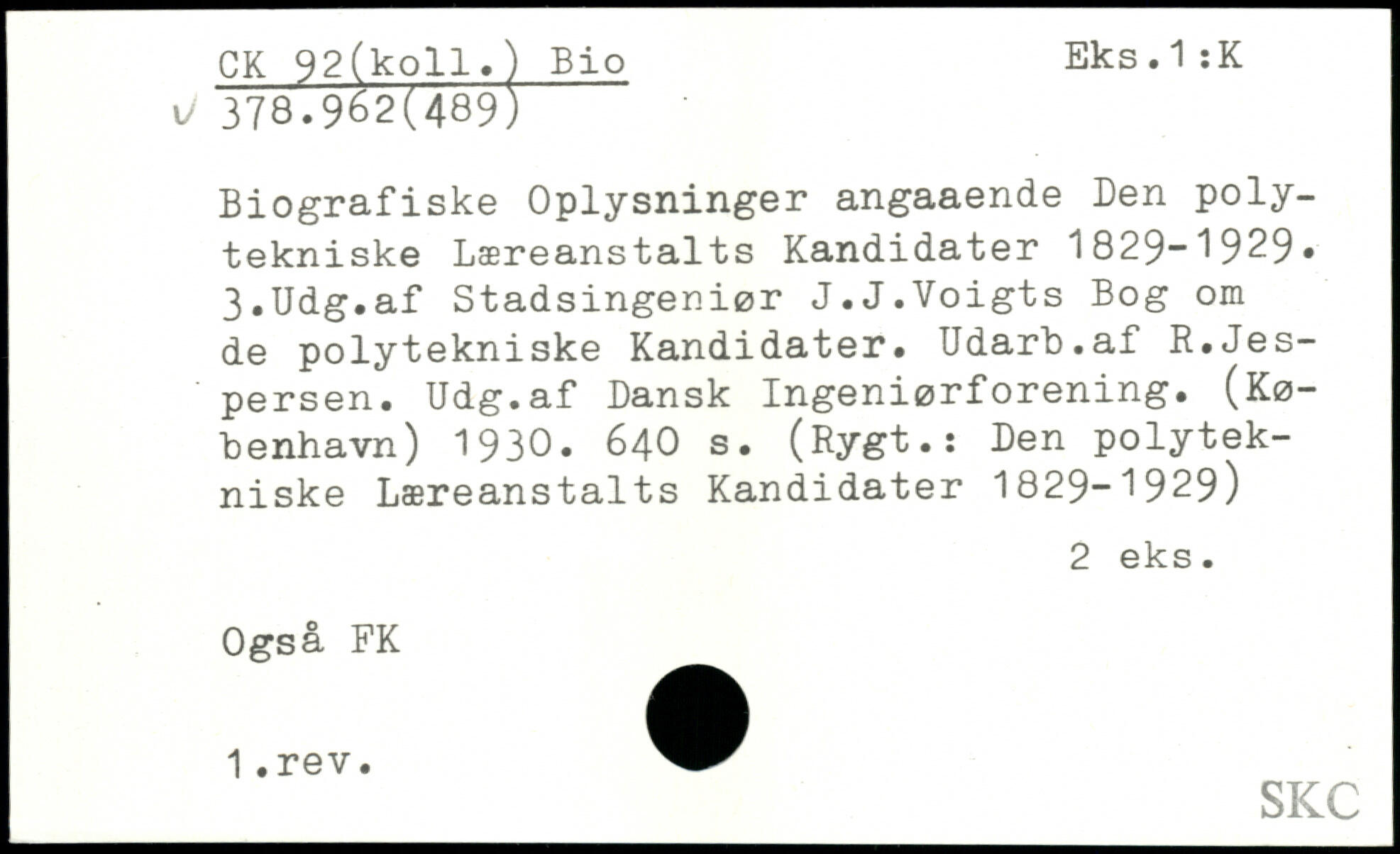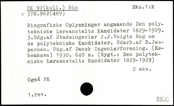 Biografiske Oplysninger angaaende Den polytekniske Læreanstalts Kandidater 1829-1929, 3.Udg.af Stadsingeniør J.J.Voigts Bog om de polytekniske Kandidater. Udart,.af R.Jespersen. Udg.af Dansk Ingeniørforening. (København) 1930. 64O s. (Rygt.: Den polytekniske Læreanstalts Kandidater 1829-1929)