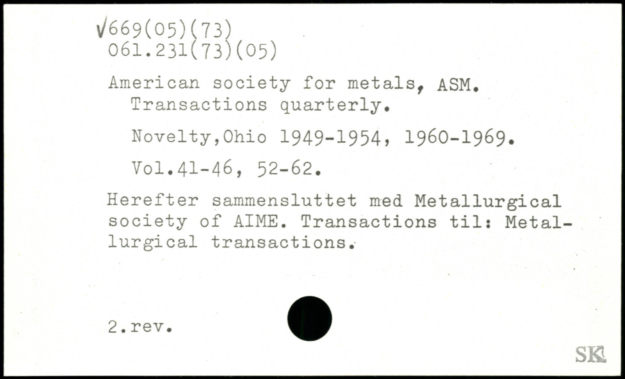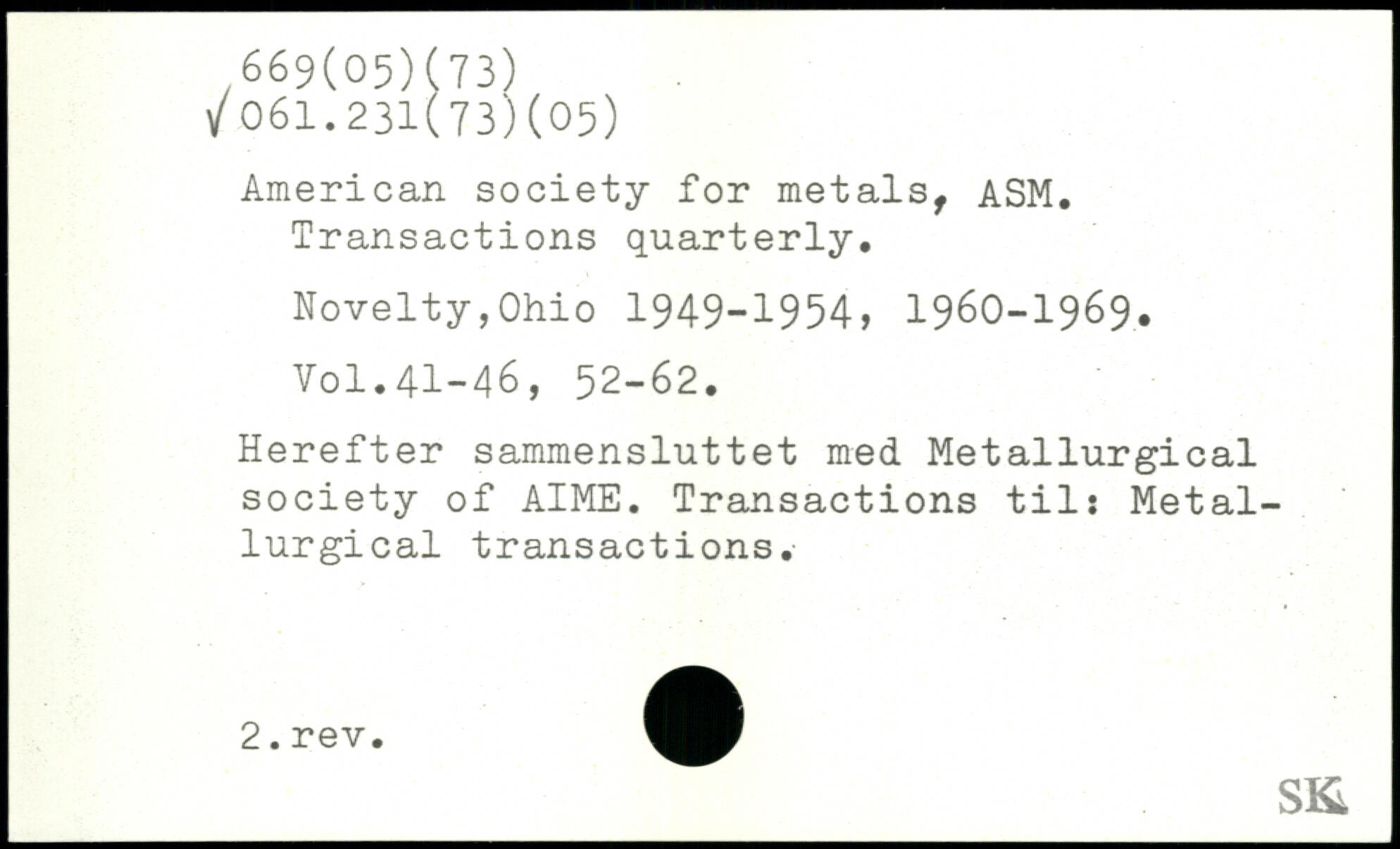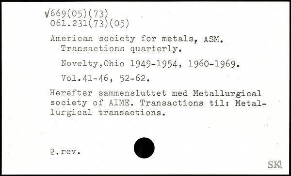 American society for metals, ASM. Transactions quarterly. Novelty,Ohio 1949-1954, 1960-1969. Yol.41-46, 52-62. Herefter sammensluttet med Metallurgical society of AIME. Transactions til; Metallurgical transactions.