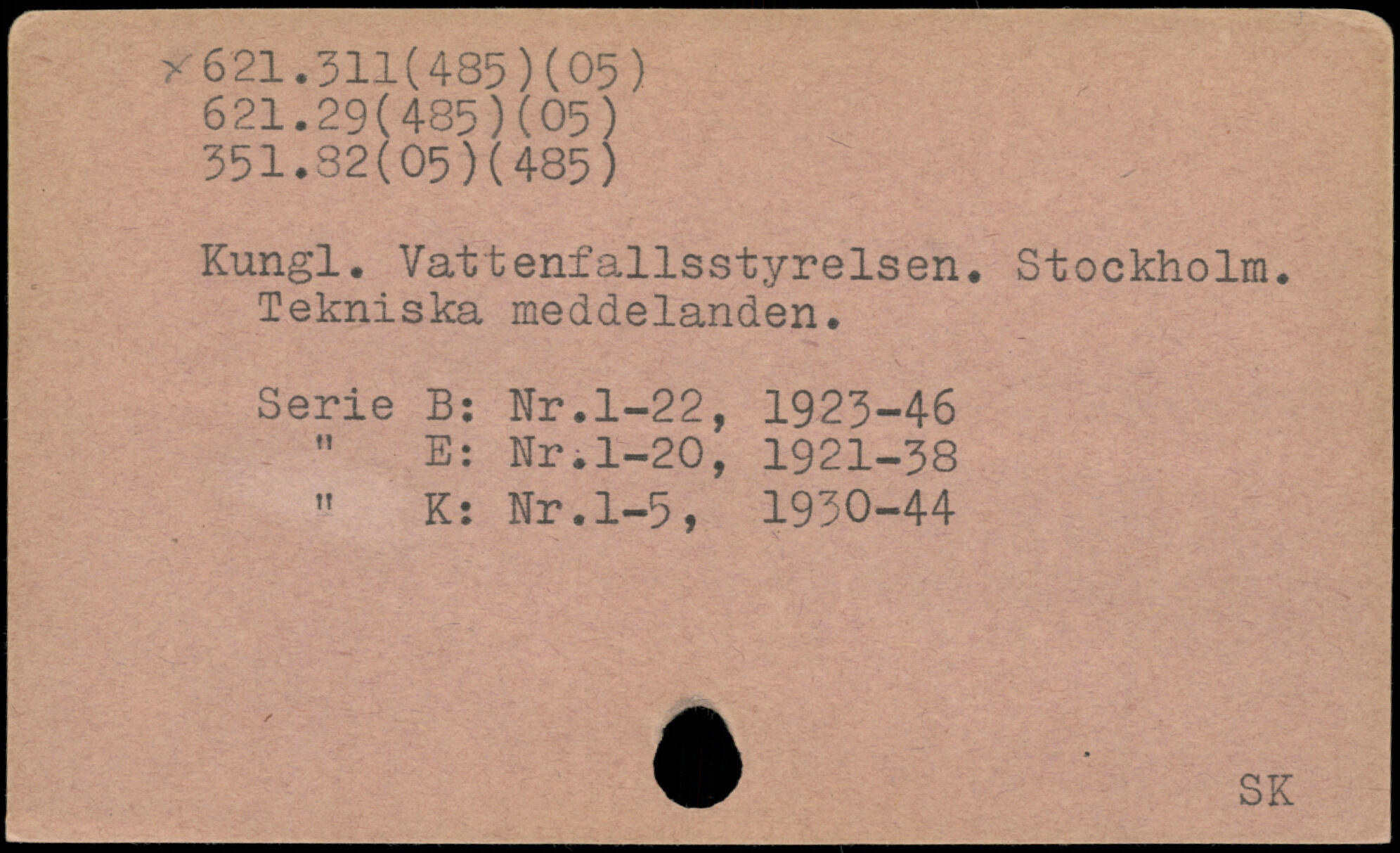 Kungl. Vattenfallsstyrelsen. Stockholm. Tekniska meddelanden. Serie B: Nr.1-22, 1923-46 " E: Nr.1-20, 1921-38 " K: Nr.1-5, 1930-44
