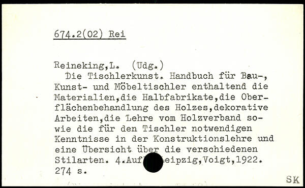 Reineking,L. ('Udg.) Die Tischlerkunst. Handbuch für Bau-, Kunst- und Möbeltischler enthaltend die Materialien,die Halbfabrikate,die Oberflächenbehandlung des Holzes,dekorative Arbeiten,die Lehre vom Holzverband sowie die für den Tischler notwendigen Kenntnisse in der Konstruktionslehre und eine Übersicht über die verschiedenen Stilarten. 4.-kuf^fc<eipzig,Voigt,1922.