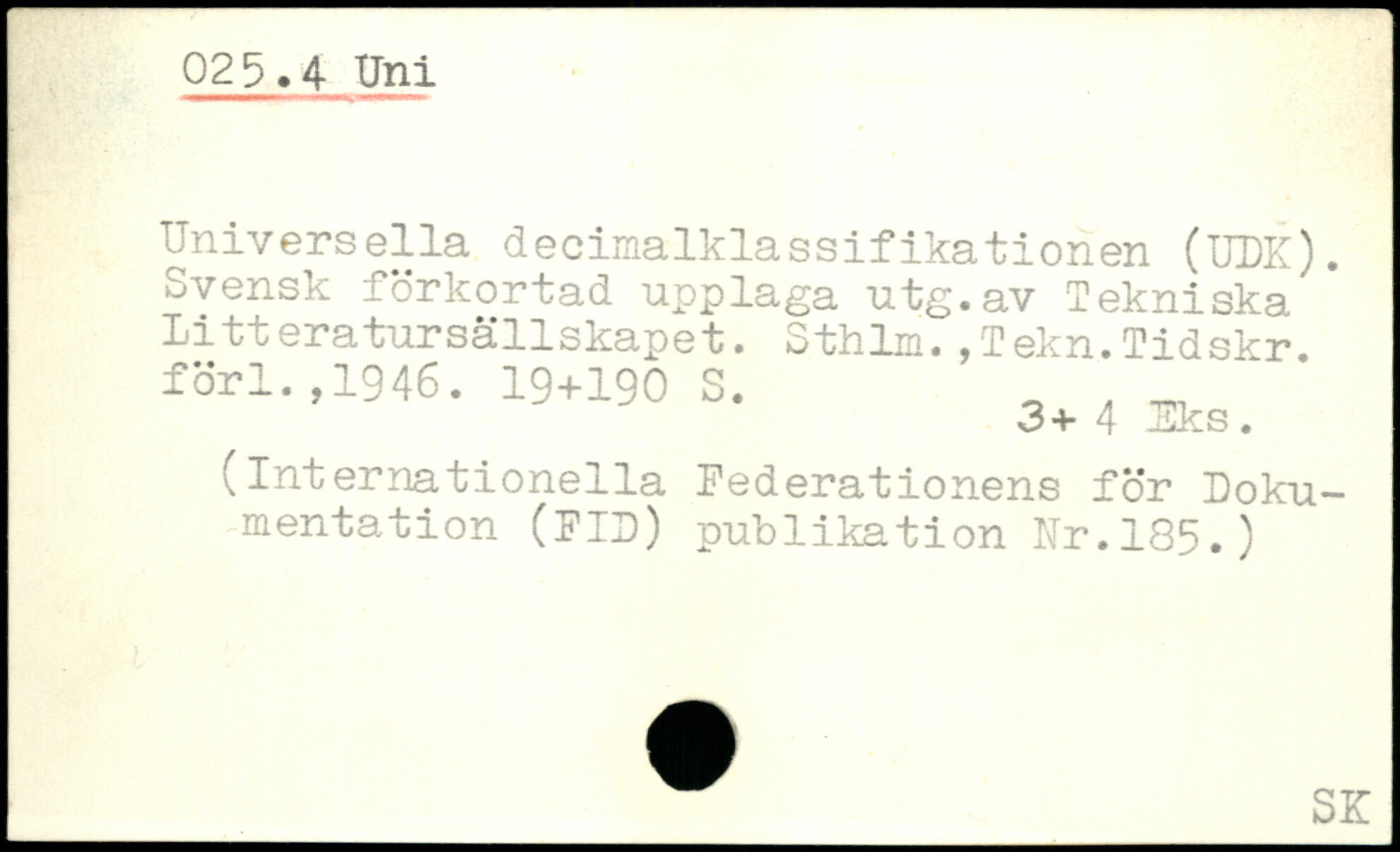 Universella decimalklassifikationen (UM). Svensk förkortad upplaga utg.av Tekniska litteratursällskapet. Sthlm.,Tekn.Tidskr. förl.,1946.