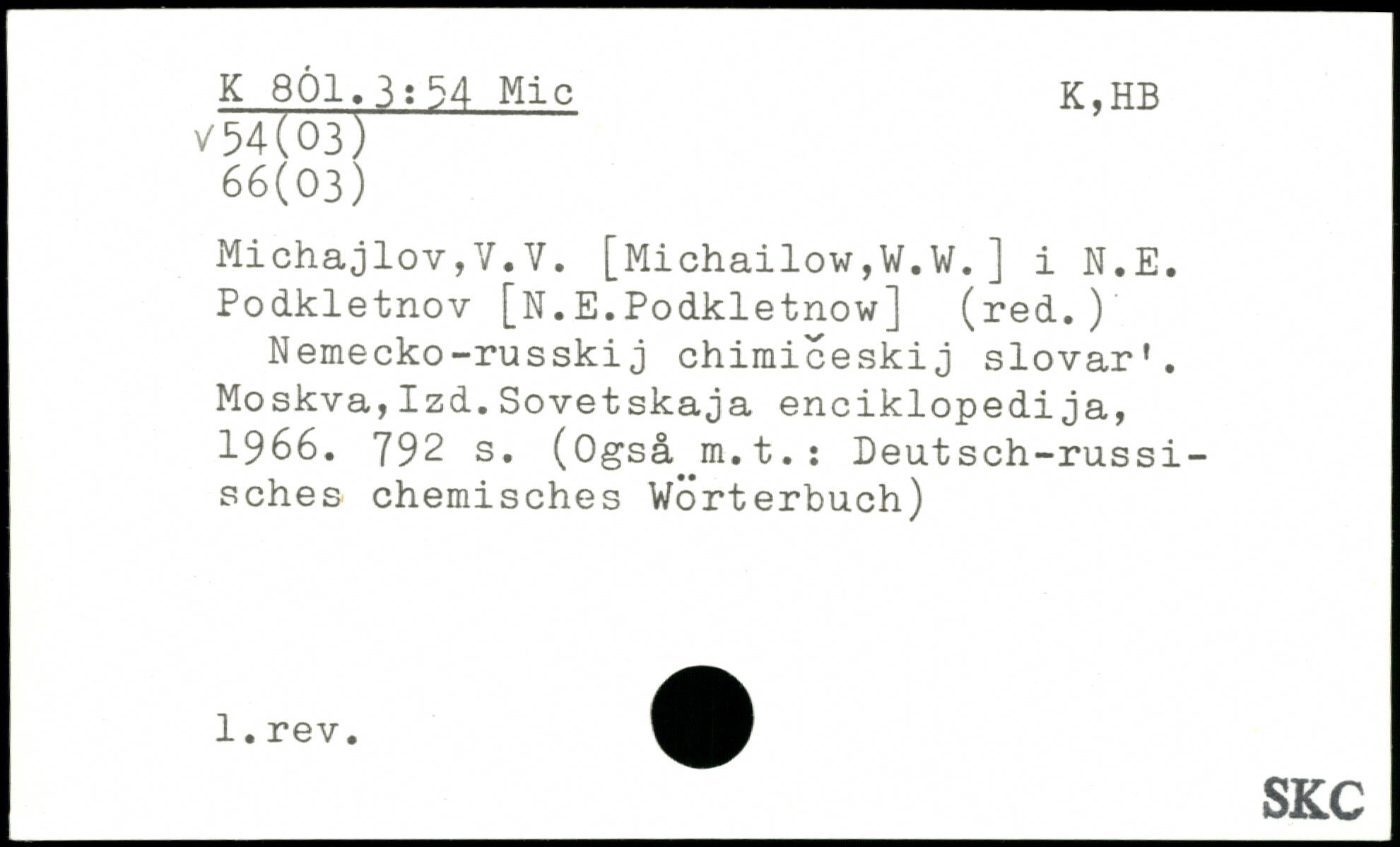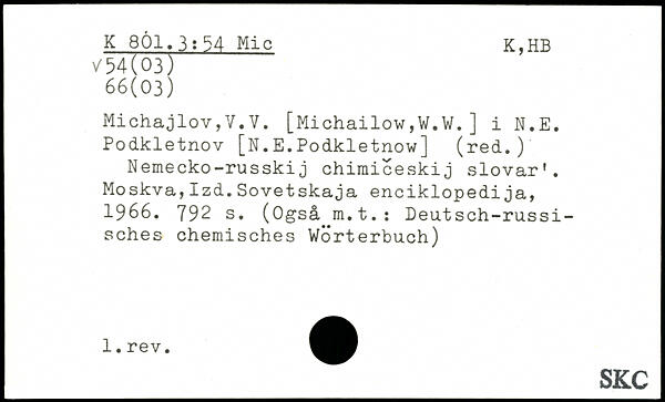 Michajlov,V.V. [Michailow,W.W.] i N.E. Podkletnov [N.E.Podkletnow] (red.) Nemecko-russkij chimiceskij slovar.. Moskva,Izd.Sovetskaja enciklopedija, 1966.