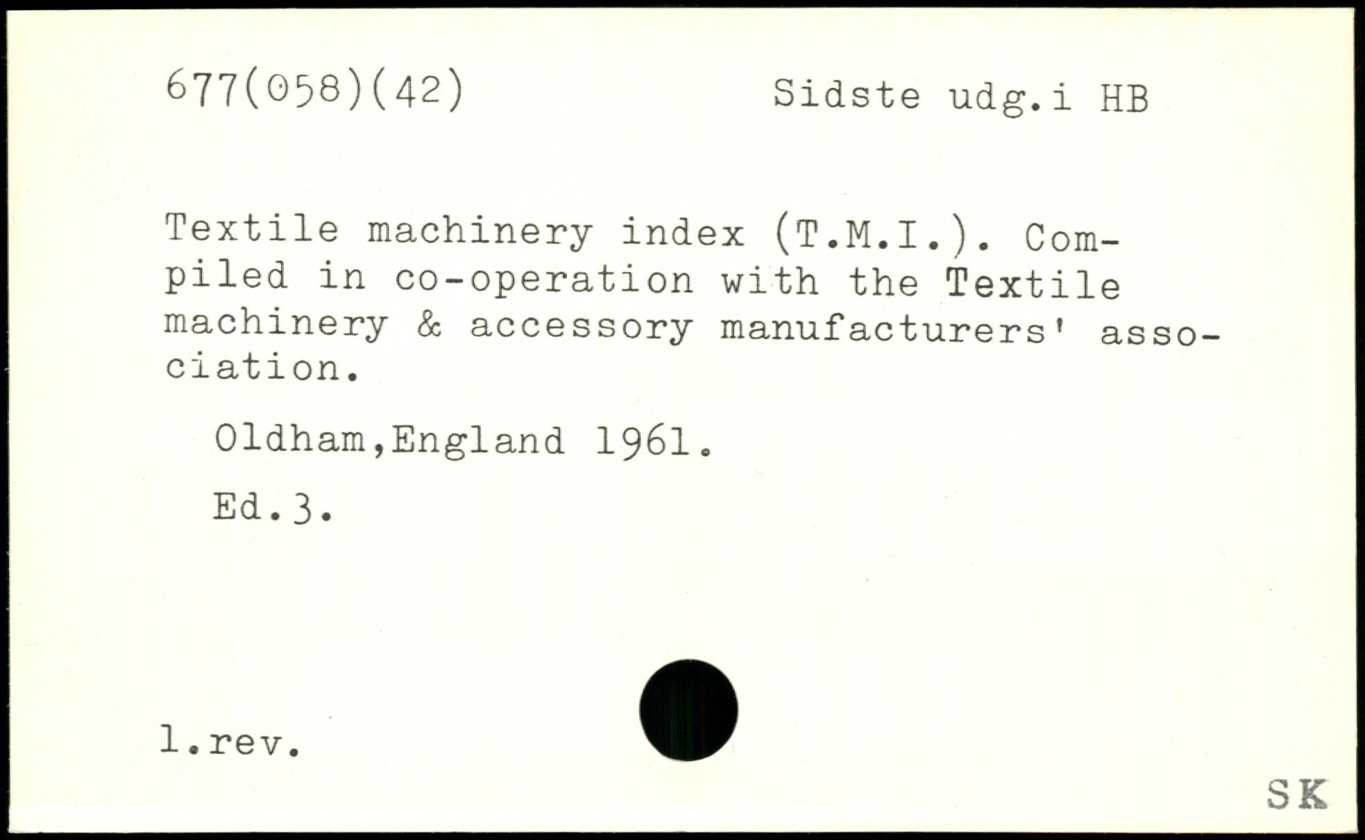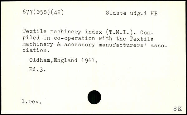 Textile machinery index (T.M.I.). Compiled in co-operation with the Textile machinery & accessory manufacturers' association. Oldham,England 1961. Ed.3.