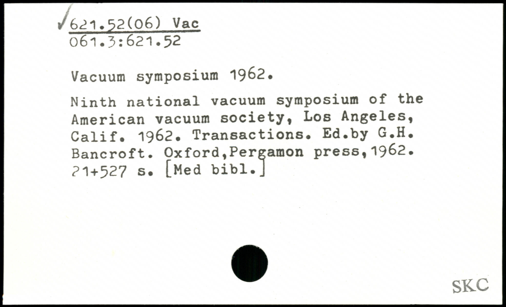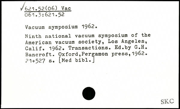 Vacuum symposium 1962. Ninth national vacuum symposium of the American vacuum society, Los Angeles, Calif. 1962. Transactions. Ed.by G.H. Bancroft.